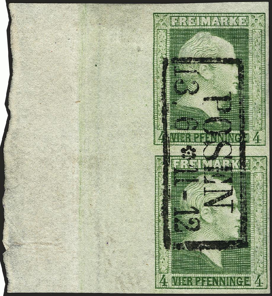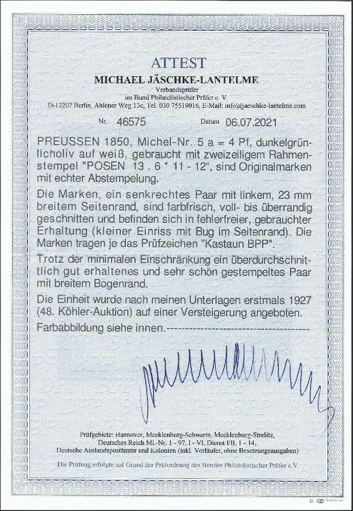| Zusatzinformationen und Suchstichworte: | 377. Auktion Heinrich Köhler 20. - 25. September 2021 Los 145 4 Pfennig dunkelgrünlicholiv im senkrechten Paar vom linken Bogenrand, farbfrisch und voll- bis breitrandig, links mit ca. 23 mm Büttenrand (hier kleiner Einriß), ideal entwertet durch Rahmenstempel "POSEN 13.6". Im Bogenrand unauffällige senkrechte Bugspur, sonst tadellos. Ein sensationelles Stück. Signiert Kastaun BPP und W. Balasse, Fotoattest Jäschke-L. BPP (2021) Ausruf 500,00 EUR Zuschlag 2.400,00 EUR (aus der Sammlung Erivan Haub) |