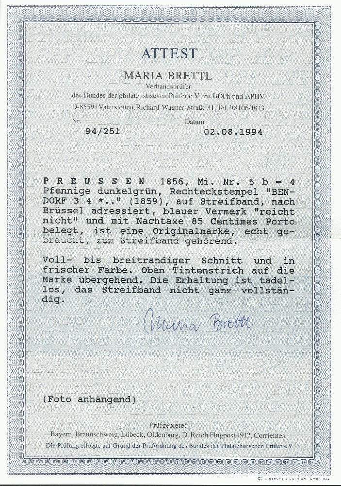 | Zusatzinformationen und Suchstichworte: | 377. Auktion Heinrich Köhler 20. - 25. September 2021 Los 146 4 Pfennig dunkelgrün, farbfrisch und voll- bis breitrandig mit Rahmenstempel "BENDORF 3 4" (1859) auf rechts nicht ganz komplettem Streifband mit kleinem Teil des Inhaltes nach Brüssel mit handschriftlichem Vermerk "Freiexemplar". Das Porto für Drucksachen nach Belgien betrug nach dem Postvertrag von 1852 6 Pfennige pro Blatt, entsprechender Vermerk "reicht nicht". Belgien vergütete an Preußen "4" Decimes (=3 Silbergroschen). In Brüssel wurden weitere 45 Centimes (1 Centimes pro Blatt innerbelgischer Drucksachentarif) hinzugezählt und insgesamt "85" Centimes vom Empfänger erhoben (entsprechender rückseitiger Empfängervermerk). Ein interessanter und attraktiver Beleg. Fotoatteste Brettl BPP (1994) und Van der Linden BPP (1994) Ausruf 300,00 EUR Zuschlag 650,00 EUR (aus der Sammlung Erivan Haub) |