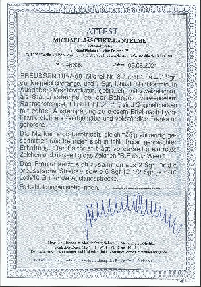 | Zusatzinformationen und Suchstichworte: | 377. Auktion Heinrich Köhler 20. - 25. September 2021 Los 153 3 Silbergroschen dunkelorange, 2 Einzelwerte in Mischfrankatur mit Gittergrund 1 Silbergroschen lebhaftrötlichkarmin, alle farbfrisch und voll- bis breitrandig mit zweimal sauber aufgesetztem Stations-Rahmenstempel "ELBERFELD *" (1859) auf komplettem Faltbrief der 2. französischen Gewichtsstufe nach Lyon. Sehr schöne frische und tadellose Erhaltung. Eine attraktiver und in dieser Form seltener Auslandsbrief. U.a. signiert Friedl, Wien, Fotoattest Jäschke-L. BPP (2021) Ausruf 200,00 EUR Zuschlag 950,00 EUR (aus der Sammlung Erivan Haub) |