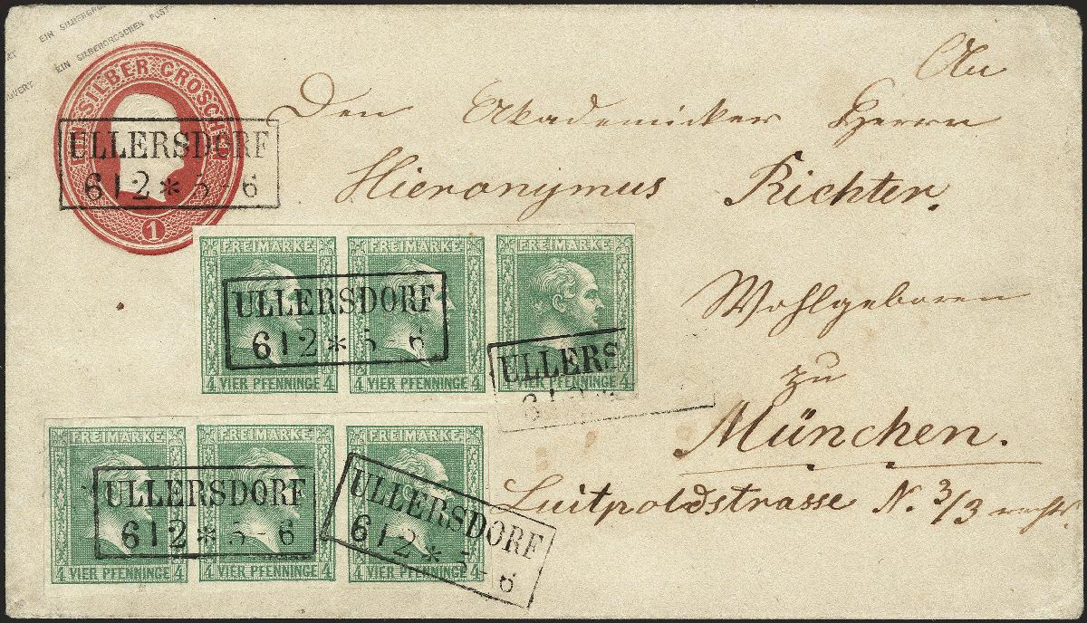 | Zusatzinformationen und Suchstichworte: | 377. Auktion Heinrich Köhler 20. - 25. September 2021 Los 161 4 Pfennige gelblichgrün, 2 waagerechte 3er-Streifen, voll- bis meist breitrandig als Zufrankatur auf Ganzsachenumschlag 1 Silbergroschen rosa, Marken und Wertstempel sauber entwertet durch Rahmenstempel "ULLERSDORF 6/2" (1862) nach München mit Ankunftsstempel. Der obere Streifen rechts winziger Randspalt die Randlinie berührend sowie ganz minimale Aufklebefalte, sonst tadellose und ursprüngliche Erhaltung. Eine ganz außergewöhnliche 3 Silbergroschen-Frankaturkombination und sicherlich einer der attraktivsten Briefe mit der 4 Pfennig-Marke. Signiert Metzer, Qualtitäts-Prüfungsbefund Maria Brettl (1991) Ausruf 2.000,00 EUR Zuschlag 3.800,00 EUR (aus der Sammlung Erivan Haub) |