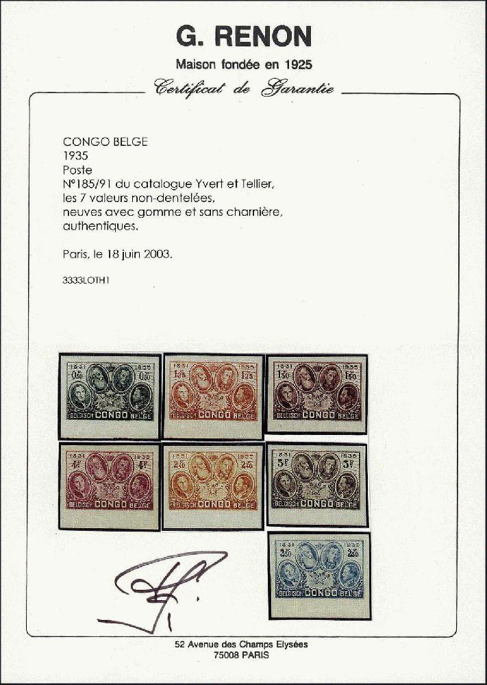 | Zusatzinformationen und Suchstichworte: | Götz 404. Auktion 20. - 25. November 2023 Los 2110 Belgisch-Kongo 50 Jahre Staat 1935 ungezähnt statt gezähnt, alle Werte breitrandig, tadellos **. Eine aussergewöhnlich seltene Serie! Farbfotoattest Renon. COB-Katalog 3.500,- € + Ausruf 700,00 EUR |
