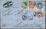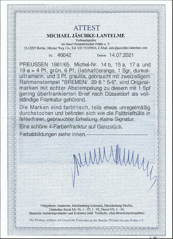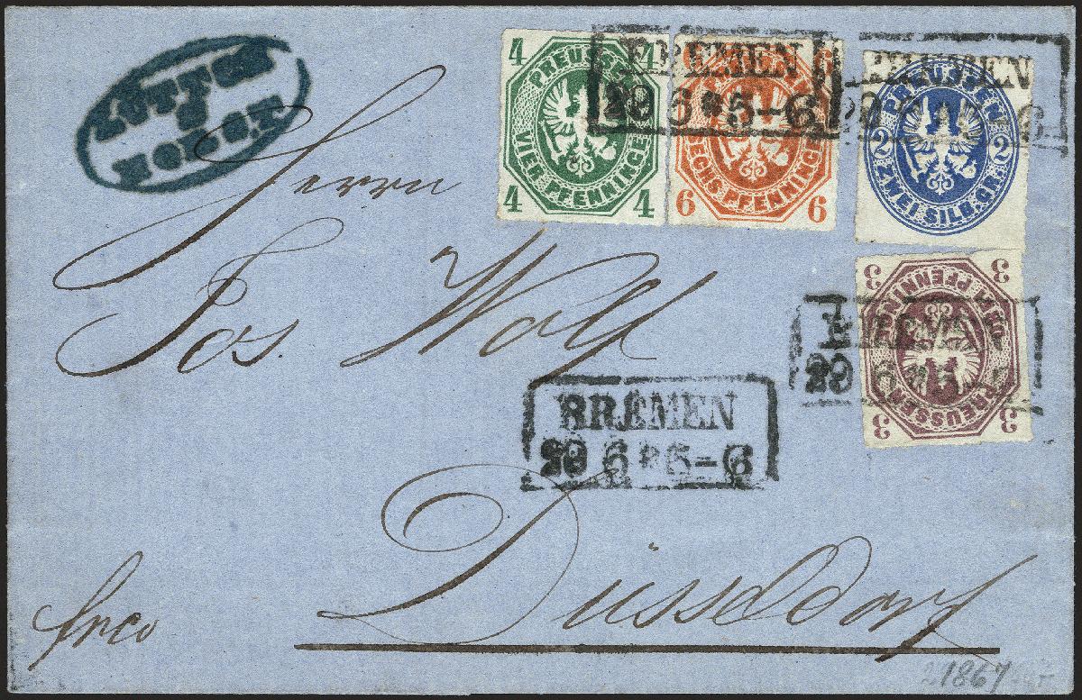 | Zusatzinformationen und Suchstichworte: | 377. Auktion Heinrich Köhler 20. - 25. September 2021 Los 177 1861, 4 Pfennige dunkelgrün, 6 Pfennige orange, 2 Silbergroschen ultramarin und Ergänzungswert 3 Pfennige graulila, alle farbfrisch und normal, teils etwas unregelmäßig durchstochen, mit sauber auf- und nebengesetztem Rahmenstempel "BREMEN 29 6" (1867) auf Briefhülle nach Düsseldorf. Eine attraktive und seltene Vierfarbenfrankatur unter Verwendung des in Bremen kaum verwendeten 3 Pfennig-Wertes, mit 1 Pfennig gering überfrankiert. Fotoattest Jäschke-L. BPP (2021) Ausruf 1.000,00 EUR Zuschlag 1.900,00 EUR (aus der Sammlung Erivan Haub) |