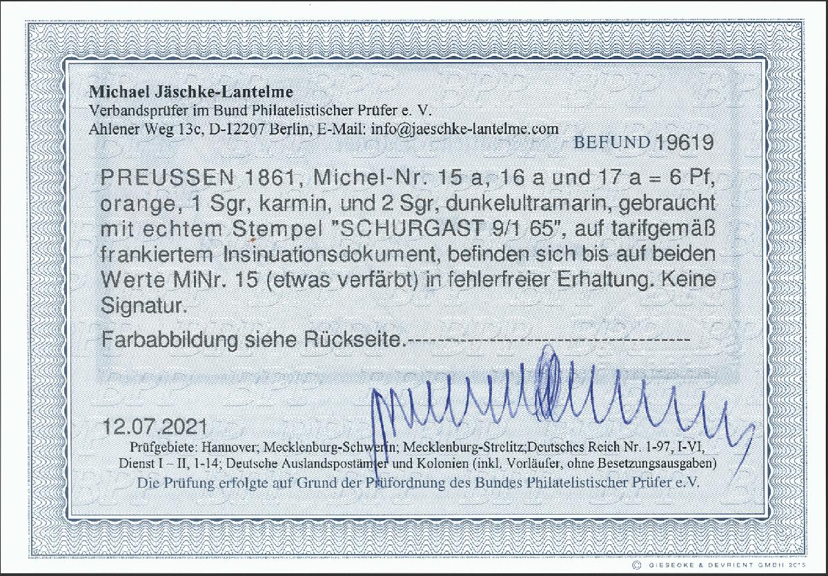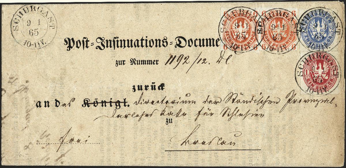 | Zusatzinformationen und Suchstichworte: | 377. Auktion Heinrich Köhler 20. - 25. September 2021 Los 181 6 Pfennige orange im waagerechten Paar (etwas oxidiert) mit 1 Silbergroschen rosa und 2 Silbergroschen ultramarin, mit jeweils klar aufgesetztem Doppelkreisstempel "SCHURGAST 9 1 65" auf Post-Insinuations-Dokument (innen etwas beschnitten). Sehr attraktiv und sonst einwandfrei. Fotobefund Jäschke-L. BPP Ausruf 150,00 EUR Zuschlag 300,00 EUR (aus der Sammlung Erivan Haub) |