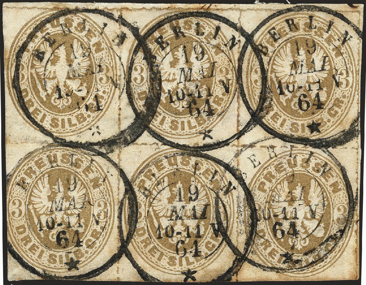 | Zusatzinformationen und Suchstichworte: | 377. Auktion Heinrich Köhler 20. - 25. September 2021 Los 186 3 Silbergroschen ocker im waagerechten 6er-Block, farbfrisch, unten und links teils Scherenschnitt, sonst gut durchstochen, jeder Wert einzeln und sauber entwertet durch Doppelkreisstempel in belgischer Versuchstype "BERLIN 19 MAI 10-11V 64" auf kleinem Briefstück; einige kleine Stockfleckchen im Rand, sonst einwandfrei. Größte bekannte Einheit mit diesem seltenen Stempel von dem nur wenige Abschläge aus 1864 bekannt sind. Signiert Kruschel und Fotoattest Jäschke-L. BPP (2021) Ausruf 1.000,00 EUR Zuschlag 2.600,00 EUR (aus der Sammlung Erivan Haub) |
