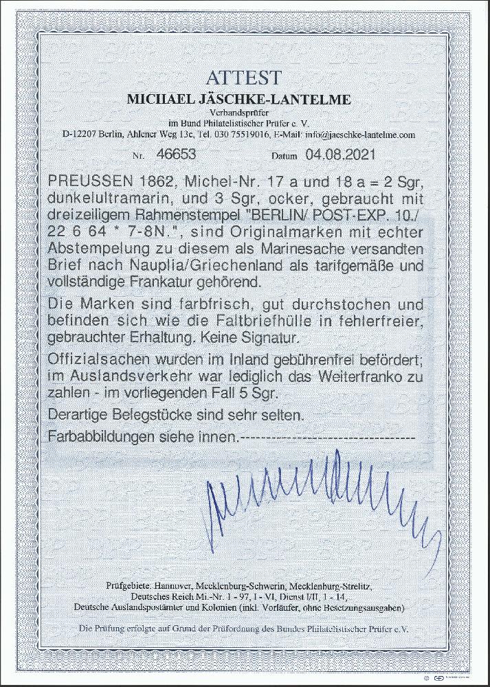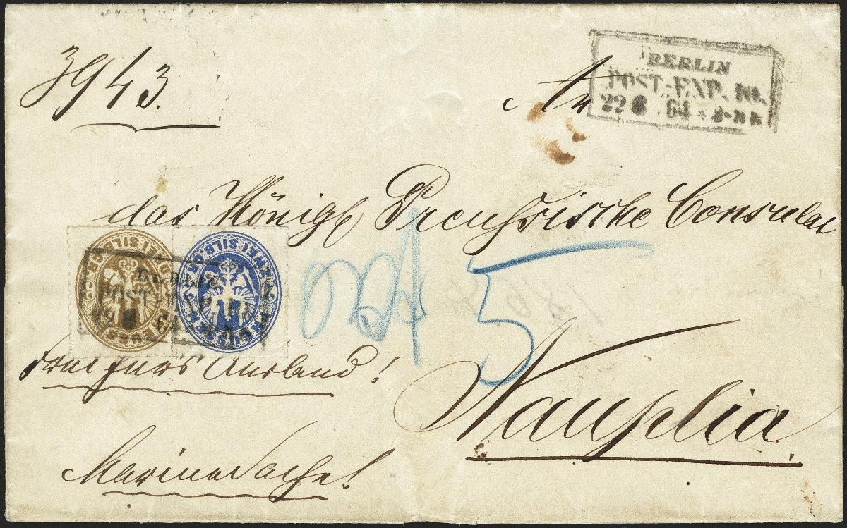 | Zusatzinformationen und Suchstichworte: | 377. Auktion Heinrich Köhler 20. - 25. September 2021 Los 187 2 Silbergroschen ultramarin und 3 Silbergroschen ocker, beide farbfrisch und gut durchstochen mit sauber auf- und nebengesetztem Rahmenstempel "BERLIN POST-EXP.10 22 6 64" auf im Inland portofreier Briefhülle mit rückseitigem Absendersiegel der königlichen Marine Intendantur sowie vorderseitigem Vermerk "Ganz für Ausland! Marinesache!" nach Nauplia in Griechenland, entsprechender Weiterfrankovermerk "wf 5". Einwandfreie Erhaltung. Ein außerordentlich seltener Auslandsbrief mit darüberhinaus sehr seltener Destination. Fotoattest Jäschke-L. BPP (2021) Ausruf 1.000,00 EUR Zuschlag 8.000,00EUR (aus der Sammlung Erivan Haub) |