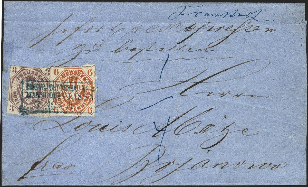 | Zusatzinformationen und Suchstichworte: | 377. Auktion Heinrich Köhler 20. - 25. September 2021 Los 191 3 Pfennige graulila (oben Scherentrennung) und 6 Pfennige rotorange mit blauem Rahmenstempel "EISENB.POST-BUREAU No.4 HANSDORF-LISSA 7 12" auf unterfrankierter Express-Briefhülle mit handschriftlichem Aufgabevermerk "Fraustadt" nach Bojanowo mit Ausgabestempel. Das fehlende Franko von "¼" vorderseitig notiert, "2½ Gr. Botenlohn" rückseitig. Der Beleg ist etwas umgefaltet, Stockflecken an der Frankatur gereinigt. Ein interessanter und ungewöhnlicher Bahnpost-Brief. Fotoattest Jäschke-L. BPP (2021) Ausruf 150,00 EUR Zuschlag 150,00 EUR (aus der Sammlung Erivan Haub) |