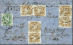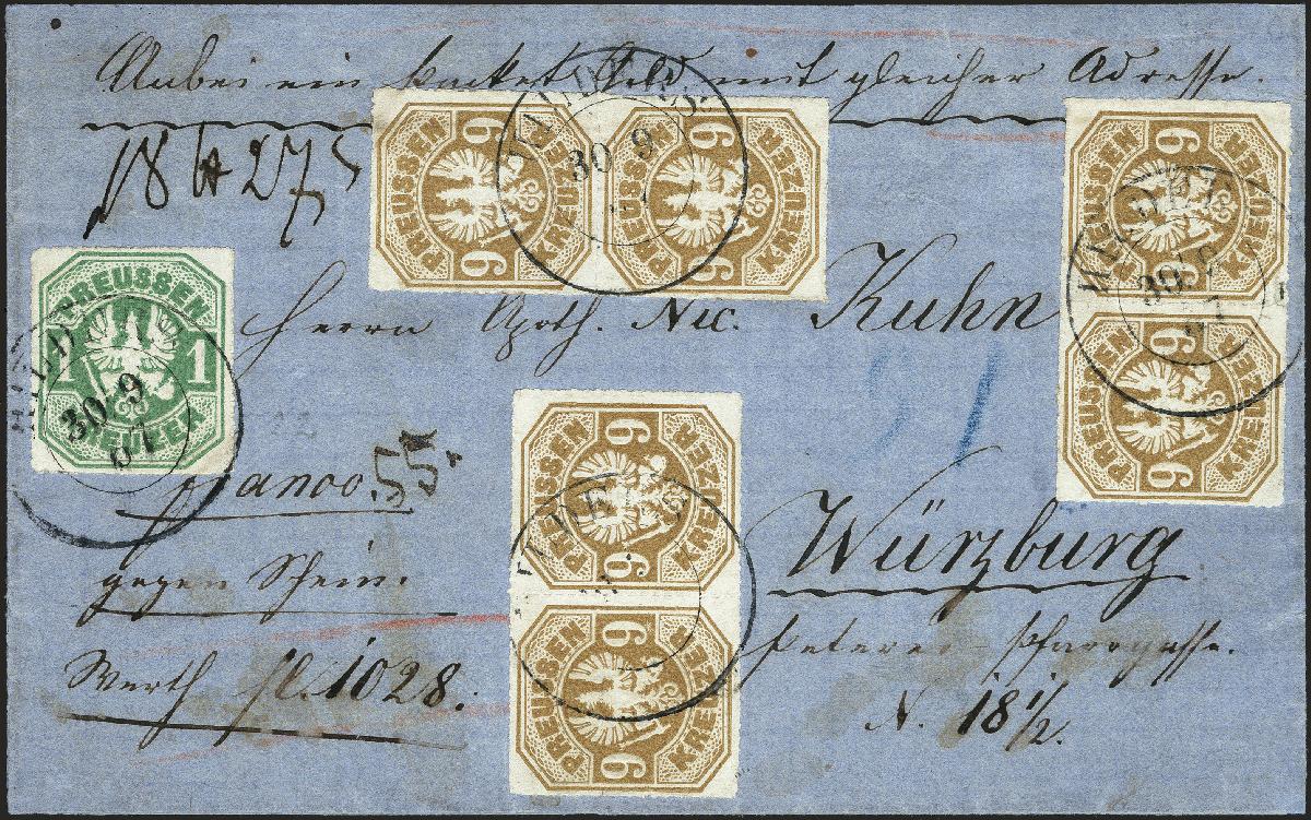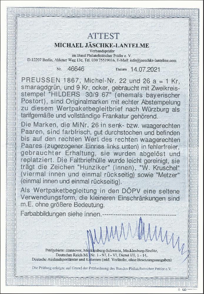 | Zusatzinformationen und Suchstichworte: | 377. Auktion Heinrich Köhler 20. - 25. September 2021 Los 199 1867, 9 Kreuzer ocker, 3 Paare zusammen mit 1 Kreuzer smaragdgrün, alle farbfrisch und gut durchstochen mit paarweise aufgesetztem Doppelkreisstempel "HILDERS 30/9 67" auf Paketbegleitbrief nach Würzburg mit rückseitigem Paketzettel. Bei einer 9 Kreuzer kleiner Randriß geschlossen, sonst einwandfreie Erhaltung, die Hülle leicht gereinigt. Die wohl spektakulärste Frankatur der ehemaligen bayerischen Postorte, die nach dem Krieg 1866 an Preußen abgetreten werden mussten. Signiert Kruschel und Metzer, Fotoattest Jäschke-L. BPP (2021) Ausruf 1.000,00 EUR Zuschlag 6.500,00 EUR (aus der Sammlung Erivan Haub) |