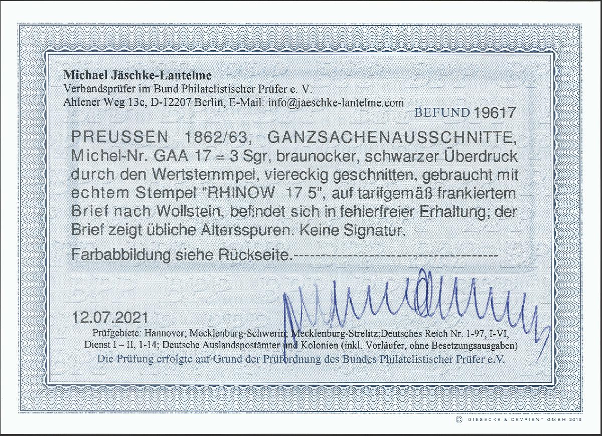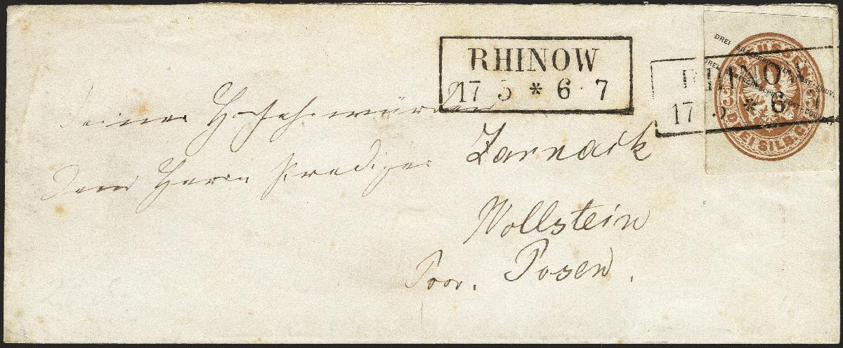 | Zusatzinformationen und Suchstichworte: | 377. Auktion Heinrich Köhler 20. - 25. September 2021 Los 202 1862/63, Ganzsachenausschnitt 3 Silbergroschen braunocker, breitrandig viereckig geschnitten mit sauber auf- und nebengesetztem Rahmenstempel "RHINOW 17 5" nach Wollstein mit Ausgabestempel; das Kuvert gering unfrisch, sonst einwandfrei. Fotobefund Jäschke-L. BPP Ausruf 80,00 EUR Zuschlag 110,00 EUR (aus der Sammlung Erivan Haub) |