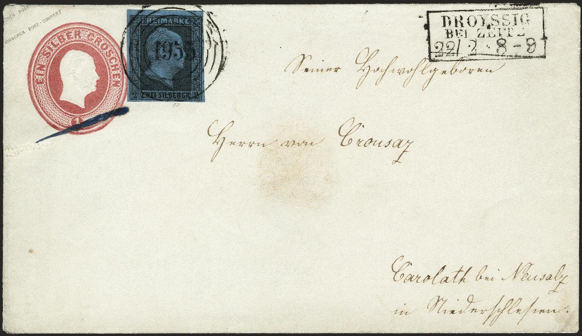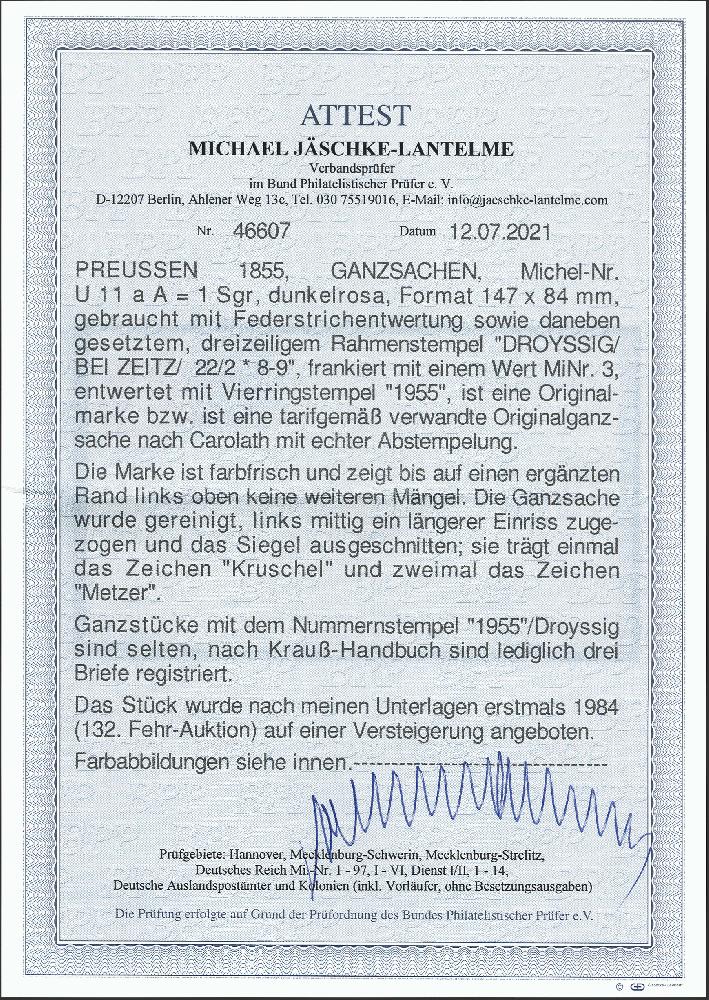 | Zusatzinformationen und Suchstichworte: | 377. Auktion Heinrich Köhler 20. - 25. September 2021 Los 207 1855, Umschlag 1 Silbergroschen dunkelrosa im Kleinformat mit Zufrankatur 1850, 2 Silbergroschen schwarz auf blau mit zentrisch und sauber aufgesetzter Nummer "1955" und nebengesetztem Rahmenstempel "DROYSSIG bei Zeitz 22/2" nach Carolath bei Neusalz. Bei der Marke ist der linke obere Rand ergänzt, ein Einriß in der Ganzsache links geschlossen, sonst einwandfreie und attraktive Erhaltung. Ein seltener Nummernstempel-Beleg; es sind nur 2 weitere Briefe dieses Ortes registriert. Fotoattest Jäschke-L. Ausruf 300,00 EUR Zuschlag 420,00 EUR (aus der Sammlung Erivan Haub) |