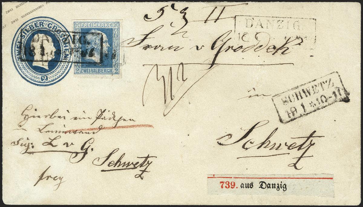 | Zusatzinformationen und Suchstichworte: | 377. Auktion Heinrich Köhler 20. - 25. September 2021 Los 209 1855, Umschlag 2 Silbergroschen blau mit Zufrankatur Glatter Grund 2 Silbergroschen blau, farbfrisch und voll- bis breitrandig mit Rahmenstempel "DANZIG 18 1" als Paketbegleitbrief nach Schwetz mit vorderseitigem Paketzettel. Das Kuvert rückseitig minimale Ausbesserung, sonst einwandfrei. Eine attraktive und seltene Kombination. Fotobefund Jäschke-L. BPP Ausruf 300,00 EUR Zuschlag 1.900,00 EUR (aus der Sammlung Erivan Haub) |