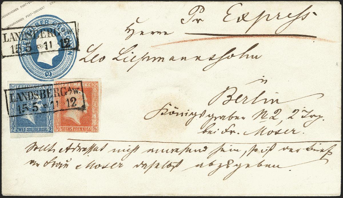 | Zusatzinformationen und Suchstichworte: | 377. Auktion Heinrich Köhler 20. - 25. September 2021 Los 213 1859, Ganzsachenumschlag 2 Silbergroschen blau mit Klappenstempel 4, Kleinformat mit Zufrankatur Gittergrund 2 Silbergroschen grauultramarin und Ergänzungswert ½ Silbergroschen rotorange, letztere voll- bis überrandig, die 2 Silbergroschen links etwas berührt, mit klaren Rahmenstempeln "LANDSBERG A/W. 15 5" als Express-Brief nach Berlin. Bei der ½ Silbergroschen oben ein kleiner Randriß geschlossen, sonst gute und attraktive Erhaltung. Signiert Metzer, Fotoattest Jäschke-L. BPP (2021) Ausruf 200,00 EUR Zuschlag 420,00 EUR (aus der Sammlung Erivan Haub) |