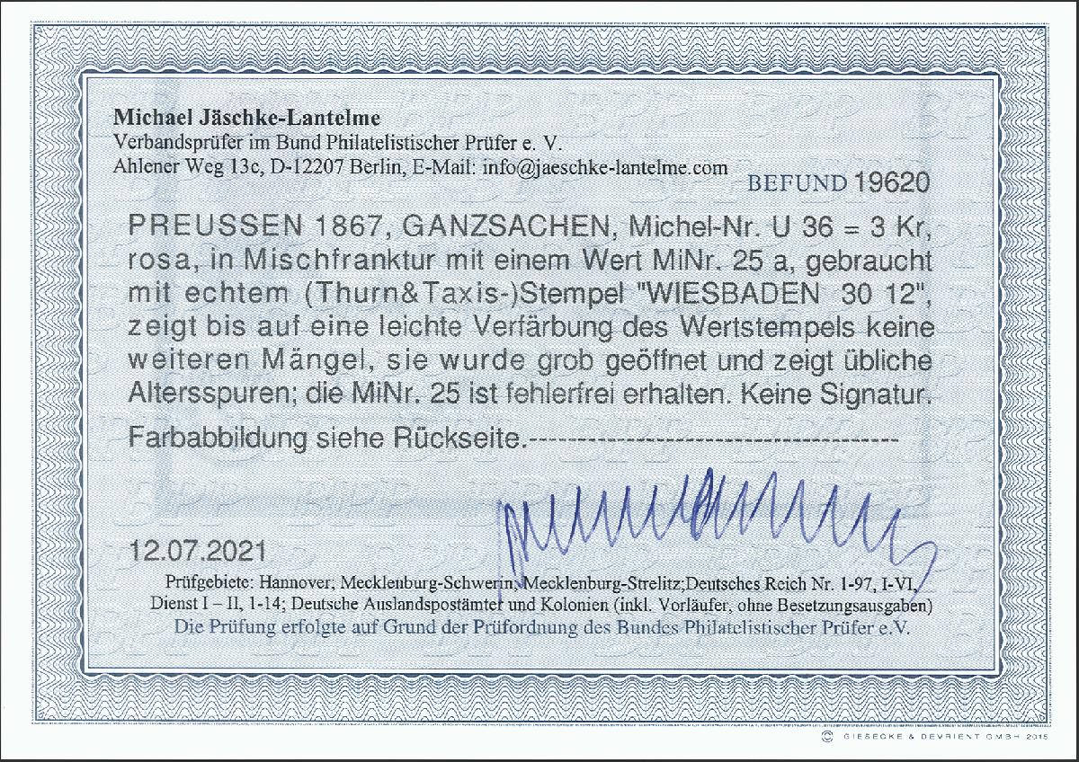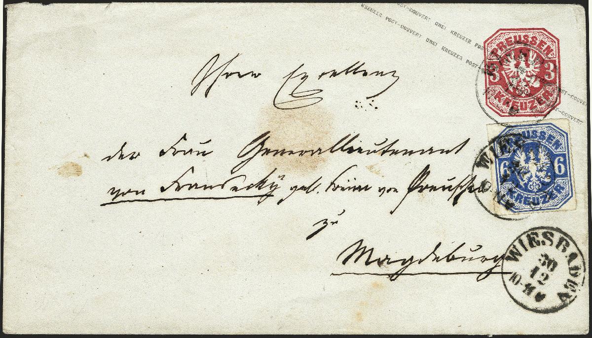 | Zusatzinformationen und Suchstichworte: | 377. Auktion Heinrich Köhler 20. - 25. September 2021 Los 216 Umschlag 3 Kreuzer rosa mit Zufrankatur 6 Kreuzer ultramarin, farbfrisch und gut durchstochen mit Einkreisstempel "WIESBADEN 30 12" (1867) nach Magdeburg. Der Wertstempel gering verfärbt und das Kuvert rückseitig etwas rauh geöffnet, sonst einwandfrei. Fotobefund Jäschke-L. BPP Ausruf 150,00 EUR Zuschlag 340,00 EUR (aus der Sammlung Erivan Haub) |