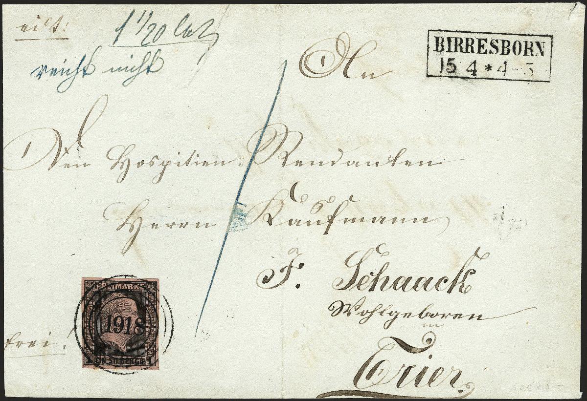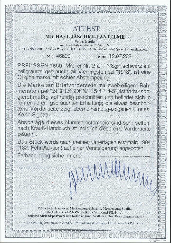 | Zusatzinformationen und Suchstichworte: | 377. Auktion Heinrich Köhler 20. - 25. September 2021 Los 218 "1918" BIRRESBORN, zentrisch und glasklar auf 1 Silbergroschen schwarz auf hellgraurot, farbfrisch und voll- bis breitrandig auf etwas beschnittener Briefvorderseite mit sauber nebengesetztem Rahmenstempel nach Trier. Einer der seltensten Nummernstempel Preußens; neben dieser Vorderseite ist kein weiteres Ganzstück registriert. Fotoattest Jäschke-L. BPP (2021) Ausruf 1.500,00 EUR Zuschlag 2.900,00 EUR (aus der Sammlung Erivan Haub) |