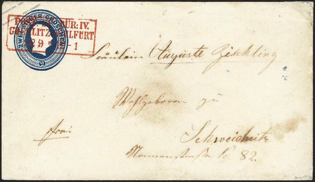 | Zusatzinformationen und Suchstichworte: | 377. Auktion Heinrich Köhler 20. - 25. September 2021 Los 220 "POST:SP:BÜR:IV./GOERLITZ-KOHLFURT/22 9", Rahmenstempel in leuchtendrot, klar abgeschlagen auf Ganzsachenumschlag 1859, 2 Silbergroschen blau nach Schweidnitz mit Ausgabestempel. Etwas unfrisch, 2 kleine Stellen oben mit Papier verstärkt, leichte Reinigungsspuren. Ein außerordentlich seltener Bahnpost-Beleg. Signiert H. Krause und Georg Bühler, Fotoattest Jäschke-L. BPP (2021) Ausruf 500,00 EUR Zuschlag 750,00 EUR (aus der Sammlung Erivan Haub) |