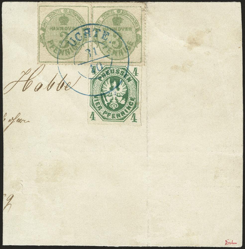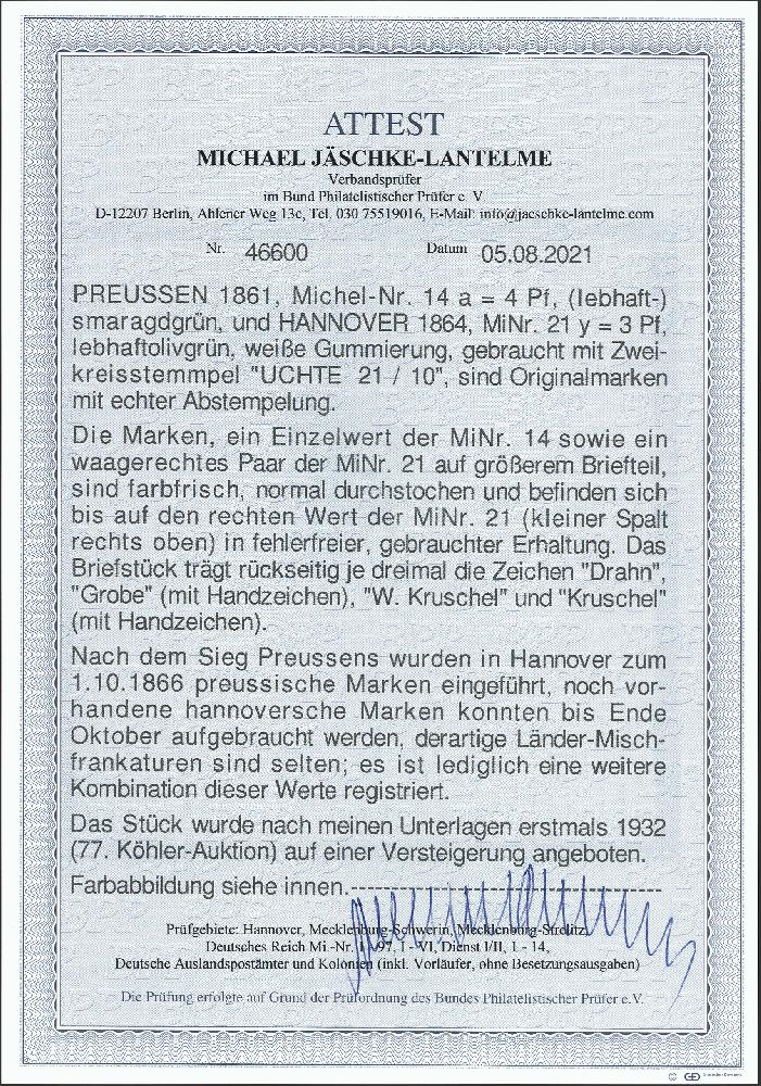 | Zusatzinformationen und Suchstichworte: | 377. Auktion Heinrich Köhler 20. - 25. September 2021 Los 222 1861, Wappenausgabe 4 Pfennige smaragdgrün in Mischfrankatur mit Hannover 1864, 3 Pfennig lebhaftolivgrün, durchstochen, im waagerechten Paar, mit sauber übergehend aufgesetztem Hannover'schen Doppelkreisstempel "UCHTE 31/10" auf größerem Briefstück. Bis auf einen kleinen Randspalt in der rechten Hannovermarke einwandfrei. Eine attraktive und seltene Mischfrankatur vom letzten Tag der Gültigkeit der Hannoverschen Freimarken. Signiert Kruschel, Drahn und Grobe sowie Fotoattest Jäschke-L. BPP (2021) Ausruf 1.500,00 EUR Zuschlag 1.900,00 EUR (aus der Sammlung Erivan Haub) |