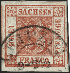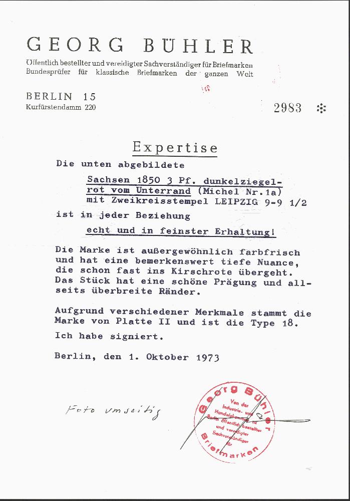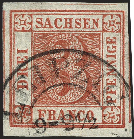 | Zusatzinformationen und Suchstichworte: | 377. Auktion Heinrich Köhler 20. - 25. September 2021 Los 223 3 Pfennige ziegelrot, Platte II, Feld 18, sehr schöne tiefe lebhaftrote Nuance, allseits sehr breitrandig, dreiseitig mit fast vollständigen Trennlinien, daran sächsisches Liniensystem erkennbar, unten mit schmalem Bogenrand, sauber entwertet durch Doppelkreisstempel von Leipzig. Ein überdurchschnittliches Exemplar in tadelloser Erhaltung. Signiert Bühler BPP mit Fotoattest (1973), Fotoattest Vaatz BPP (2021) Ausruf 2.000,00 EUR Zuschlag 7.200,00 EUR (aus der Sammlung Erivan Haub) |