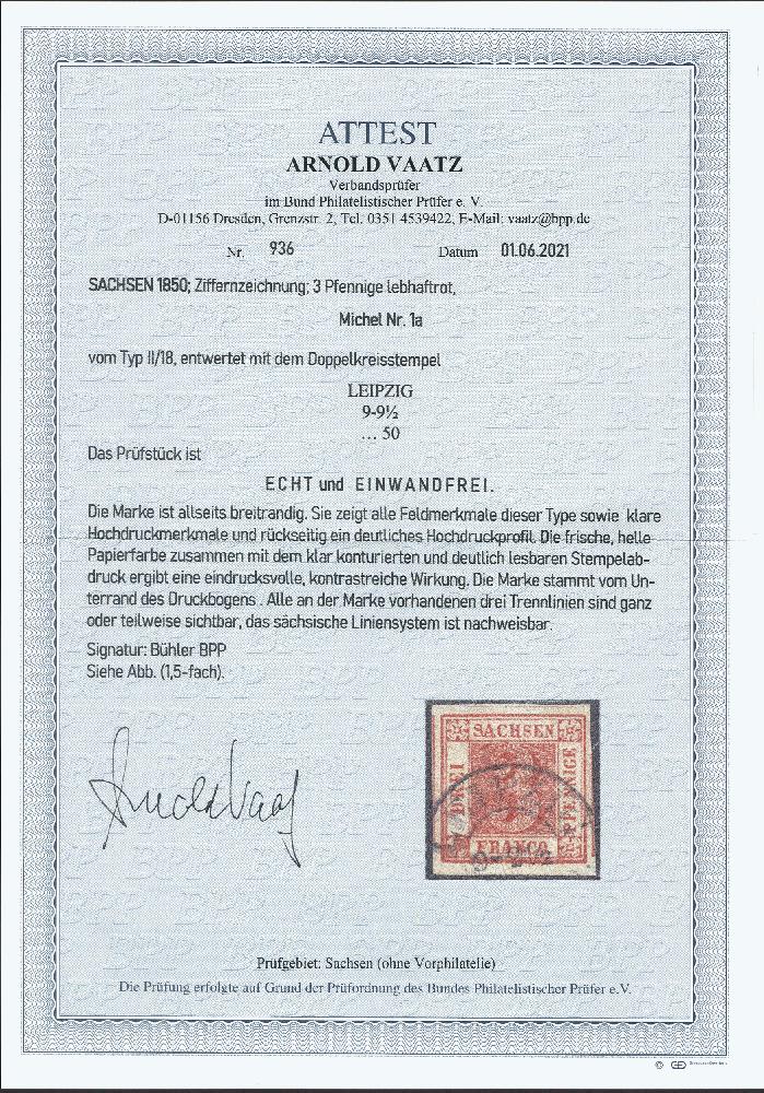 | Zusatzinformationen und Suchstichworte: | 377. Auktion Heinrich Köhler 20. - 25. September 2021 Los 223 3 Pfennige ziegelrot, Platte II, Feld 18, sehr schöne tiefe lebhaftrote Nuance, allseits sehr breitrandig, dreiseitig mit fast vollständigen Trennlinien, daran sächsisches Liniensystem erkennbar, unten mit schmalem Bogenrand, sauber entwertet durch Doppelkreisstempel von Leipzig. Ein überdurchschnittliches Exemplar in tadelloser Erhaltung. Signiert Bühler BPP mit Fotoattest (1973), Fotoattest Vaatz BPP (2021) Ausruf 2.000,00 EUR Zuschlag 7.200,00 EUR (aus der Sammlung Erivan Haub) |