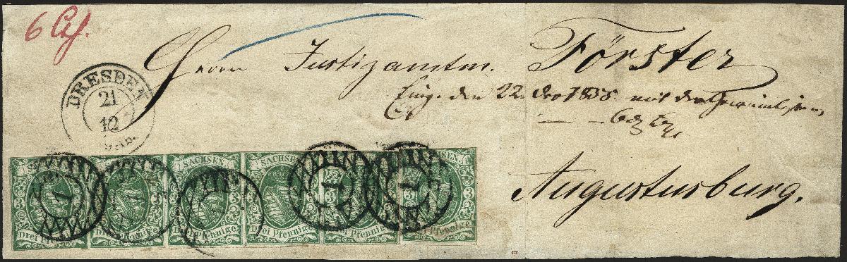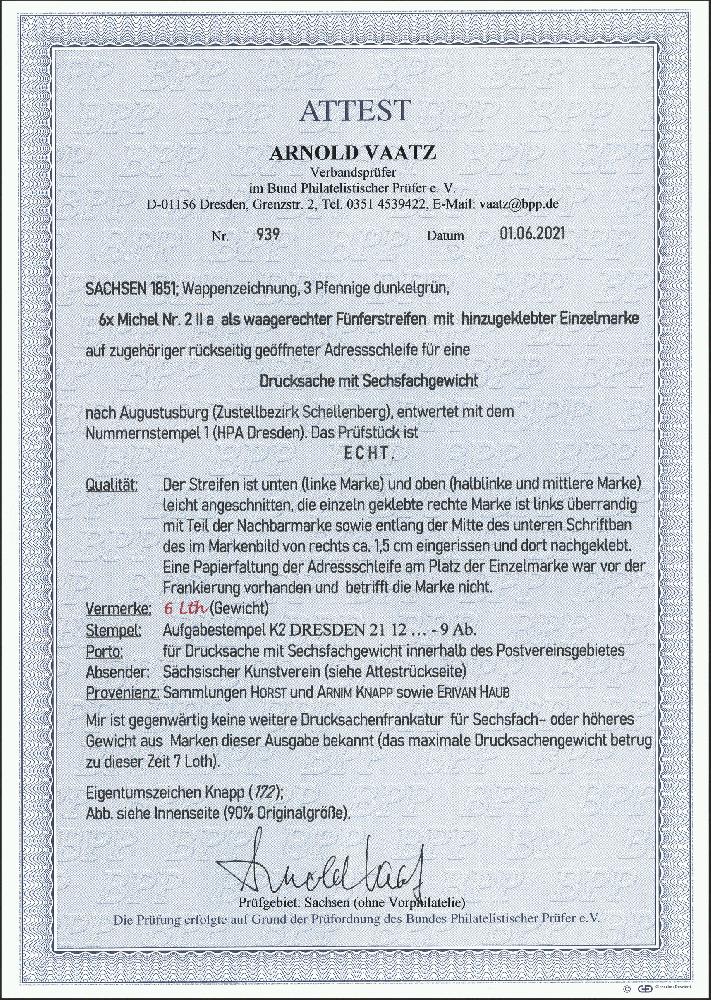 | Zusatzinformationen und Suchstichworte: | 377. Auktion Heinrich Köhler 20. - 25. September 2021 Los 226 1851/63, Wappen 3 Pfennige dunkelgrün im waagerechten 5er-Streifen und Einzelmarke, farbfrisch, teils etwas angeschnitten bis breitrandig geschnitten, mit Nummer "1" und nebengesetztem Doppelkreisstempel "DRESDEN 21/12" auf Streifband der 6. Gewichtsstufe nach Augustusburg mit vorderseitigem Eingangsvermerk vom 22.12.1855. Die Einzelmarke hat einen längeren verklebten Einriß; in der Schleife Faltungen, die Frankatur nicht beeinflussend. Insgesamt ein attraktives Stück mit außerordentlich seltener Frankatur; die Heinrich Köhler-Kartei hat keine weitere oder größere derartige Drucksachenfrankatur registriert. Ein postgeschichtlich bedeutendes Stück. Fotoattest Vaatz BPP (2021) Ausruf 2.000,00 EUR Zuschlag 7.000,00 EUR (aus der Sammlung Erivan Haub) |