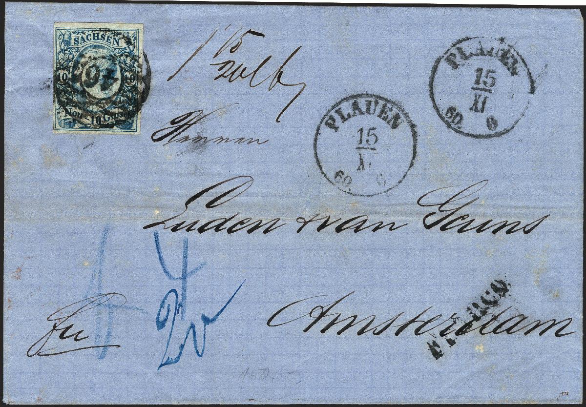 | Zusatzinformationen und Suchstichworte: | 377. Auktion Heinrich Köhler 20. - 25. September 2021 Los 230 1856/63, Johann 10 Neugroschen cyanblau in schöner tiefer Farbe, voll- bis breitrandig geschnitten, mit sauber aufgesetzter Nummer "46" und zweimal nebengesetztem Einkreisstempel "PLAUEN 15/XI 60" auf Briefhülle der 2. Gewichtsstufe nach Amsterdam. Der Brief ist portogerecht frankiert mit 6 Neugroschen Vereinsporto plus zweimal 2 Neugroschen niederländischem Porto für den 2. Rayon. Eine attraktive Einzelfrankatur in einwandfreier Erhaltung. Fotoattest Vaatz BPP (2021) Ausruf 800,00 EUR Zuschlag 1.500,00 EUR (aus der Sammlung Erivan Haub) |