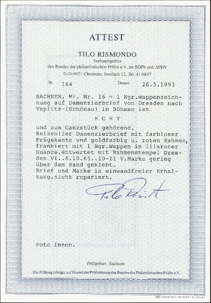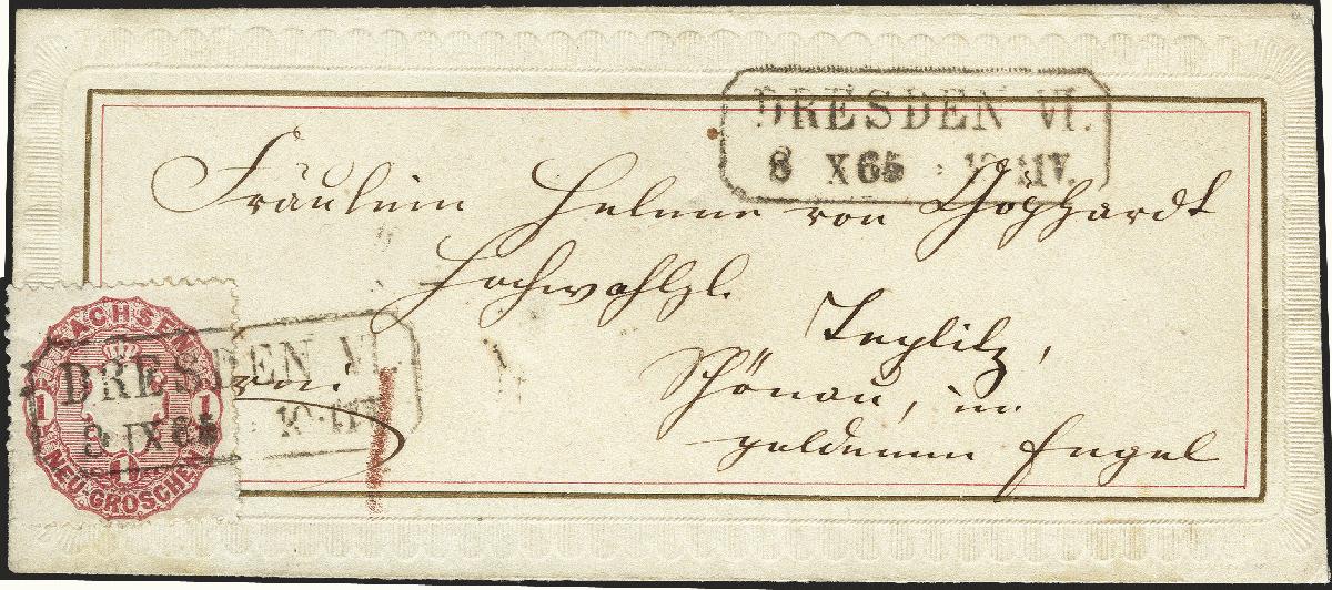 | Zusatzinformationen und Suchstichworte: | 377. Auktion Heinrich Köhler 20. - 25. September 2021 Los 233 1 Neugroschen rosa mit sauber auf- und nebengesetztem Rahmenstempel "DRESDEN VI/6 X 65" auf kleinem Damenkuvert mit geprägter Zierborde, gedrucktem Goldrand und gemalter roter Zierlinie nach Teplitz (Schönau) in Böhmen mit rückseitigem Ankunftsstempel. Die Marke links etwas über den Rand geklebt und hier in der Zähnung minimal fehlerhaft. Ein attraktiver Brief im Wechselverkehr mit Österreich. Fotoattest Rismondo BPP (1993) Ausruf 300,00 EUR Zuschlag 300,00 EUR (aus der Sammlung Erivan Haub) |
