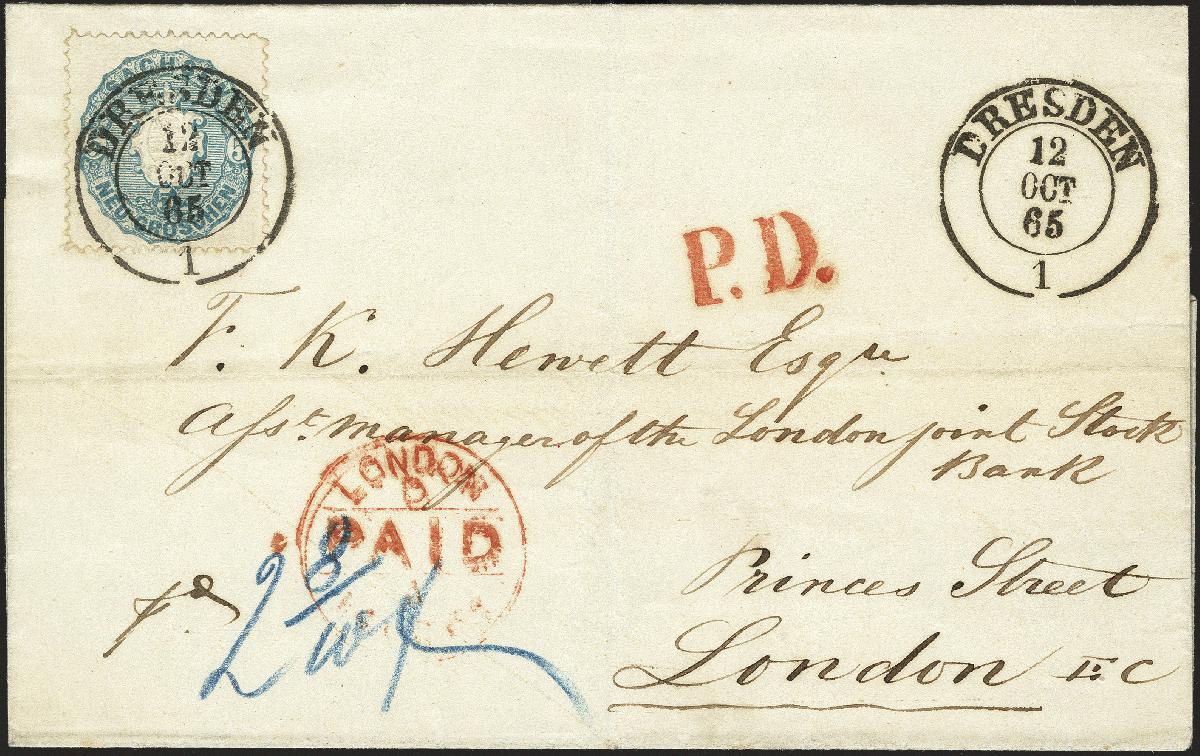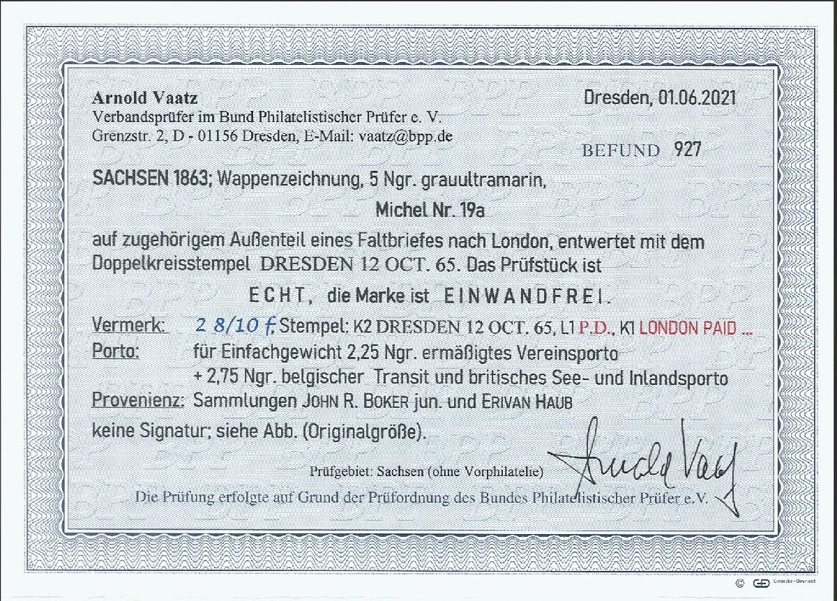 | Zusatzinformationen und Suchstichworte: | 377. Auktion Heinrich Köhler 20. - 25. September 2021 Los 234 1863/67, Wappen 5 Neugroschen grauultramarin, farbfrisch und gut gezähnt mit sauber auf- und nebengesetztem Doppelkreisstempel "DRESDEN 12 OCT 65" auf Briefhülle nach London mit vorderseitigem Eingangsstempel. Eine attraktive und tadellose Einzelfrankatur. Fotobefund Vaatz BPP (2021) Ausruf 100,00 EUR Zuschlag 380,00 EUR (aus der Sammlung Erivan Haub) |