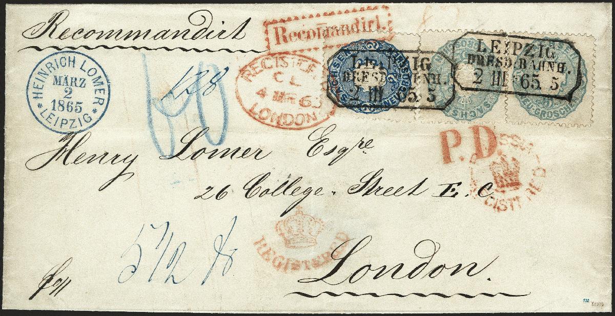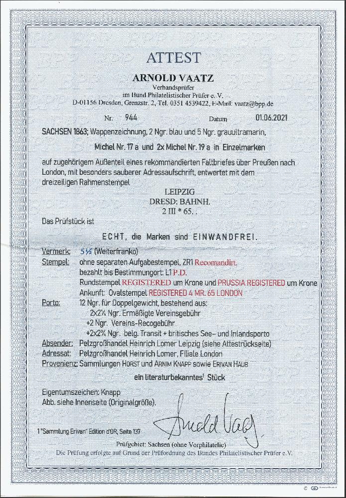 | Zusatzinformationen und Suchstichworte: | 377. Auktion Heinrich Köhler 20. - 25. September 2021 Los 235 5 Neugroschen grauultramarin, 2 Einzelwerte zusammen mit 2 Neugroschen blau, alle farbfrisch und gut gezähnt mit Rahmenstempel "LEIPZIG DRESD: BAHNH. 2 III 65" auf eingeschriebener Briefhülle der 2. Gewichtsstufe nach London mit 4 verschiedenen, teils auf die Frankatur übergehenden roten Chargé-Stempeln nach London. Das Porto setzt sich zusammen aus 4½ Neugroschen ermäßigter Vereinsgebühr, 2 Neugroschen Chargé-Gebühr sowie 5½ Neugroschen belgischer Transit sowie britisches See- und Inlandsporto. Ein attraktiver und in dieser Form seltener Auslandsbrief. Fotoattest Vaatz BPP (2021) Ausruf 400,00 EUR Zuschlag 1.100,00 EUR (aus der Sammlung Erivan Haub) |