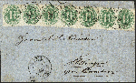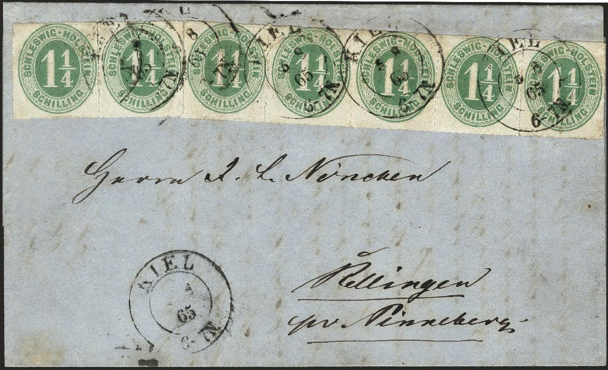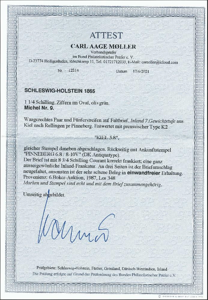 | Zusatzinformationen und Suchstichworte: | 377. Auktion Heinrich Köhler 20. - 25. September 2021 Los 242 1¼ Schilling dunkelgelblichgrün, waagerechter 5er-Streifen und Paar, farbfrisch und gut durchstochen, mit Doppelkreisstempel "KIEL 5/8 65" auf Faltbrief der 7. Gewichtsstufe (ehemals mit Beilage) nach Rellingen bei Pinneberg mit Ankunftsstempel vom nächsten Tag. Brief und Frankatur befinden sich in insgesamt guter Erhaltung, der 5er-Streifen rechts minimal über den Rand geklebt, sonst einwandfrei. Eine ganz außergewöhnliche und sehr seltene Inlandsfrankatur; die Heinrich Köhler-Kartei hat nur eine höhere Mehrfachfrankatur auf Paketbegleitbrief registriert. Fotoattest Moeller BPP (2021) Ausruf 1.000,00 EUR Zuschlag 2.300,00 EUR (aus der Sammlung Erivan Haub) |