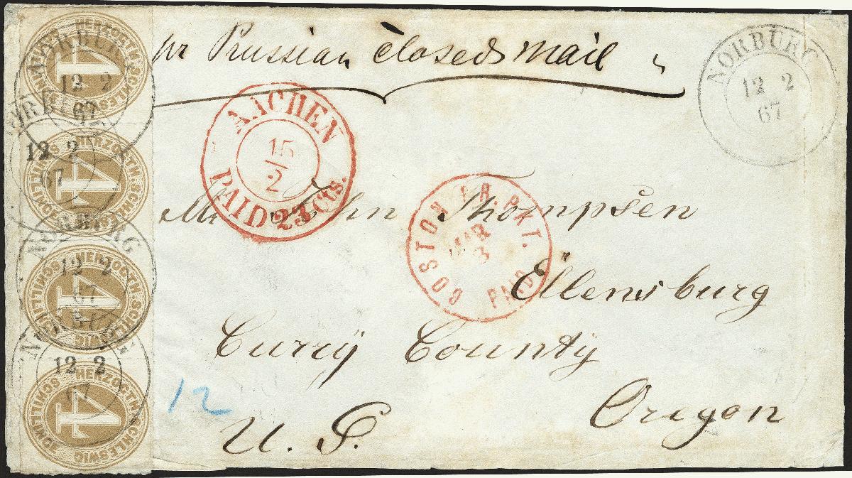 | Zusatzinformationen und Suchstichworte: | 377. Auktion Heinrich Köhler 20. - 25. September 2021 Los 243 1865, HERZOGTH.SCHLESWIG 4 Schilling braunocker im waagerechten 4er-Streifen mit Doppelkreisstempel "NORBURG 12 2 67" auf Briefkuvert "pr Prussian closed mail" nach Ellensburg in Oregon (heute im Bundesstaat Washington), USA, mit vorderseitigem Transitstempel von Aachen und "BOSTON BR.PKT.PAID". Der Streifen seitlich durch Randklebung leicht bestoßen, das Kuvert leicht fehlerhaft. Ein attraktiver und sehr seltener Transatlantik-Brief. Fotoattest Moeller BPP (2021) Ausruf 8.000,00 EUR Zuschlag 14.500,00 EUR (aus der Sammlung Erivan Haub) |