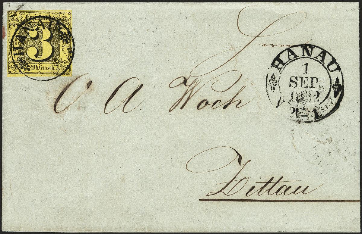| Zusatzinformationen und Suchstichworte: | 377. Auktion Heinrich Köhler 20. - 25. September 2021 Los 254 3 Silbergroschen schwarz auf gelb, farbfrisch und voll- bis breitrandig mit sauber aufgesetztem vorphilatelistischen Zierstempel "HANAU" ohne Datumseinsatz auf Briefhülle mit sauber nebengesetztem Doppelkreisstempel "HANAU 1 SEP 1852" nach Zittau. Ein attraktiver Brief. Signiert Pröschold und Haferkamp BPP sowie Fotoattest Sem BPP (2021) Ausruf 100,00 EUR Zuschlag 340,00 EUR (aus der Sammlung Erivan Haub) |