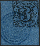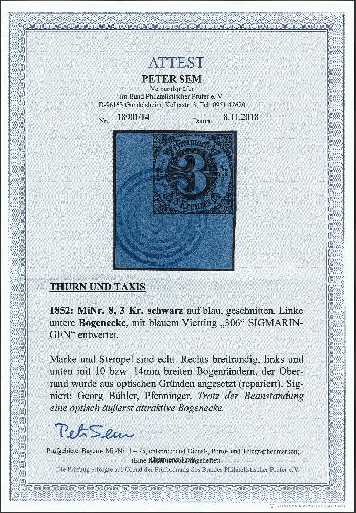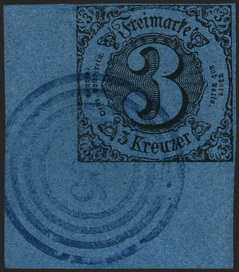 | Zusatzinformationen und Suchstichworte: | 377. Auktion Heinrich Köhler 20. - 25. September 2021 Los 255 1852/58, 3 Kreuzer schwarz auf dunkelblau, linke untere Bogenecke mit 10-14 mm Bogenrändern, rechts breitrandig, der Oberrand aus optischen Gründen ergänzt (ca. 1/1,5 mm), sehr schön sauber entwertet durch blaue Nummer "306" von Sigmaringen. Ein äußerst attraktives Stück. Fotoattest Sem BPP (2018) Ausruf 100,00 EUR Zuschlag 600,00 EUR (aus der Sammlung Erivan Haub) |