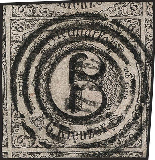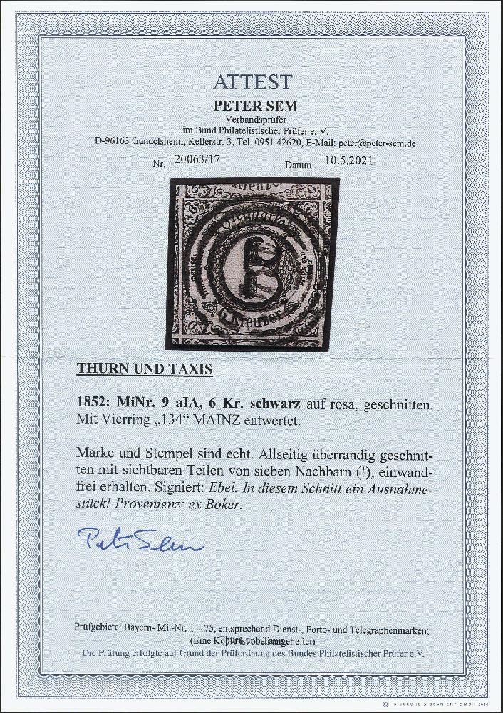| Zusatzinformationen und Suchstichworte: | 377. Auktion Heinrich Köhler 20. - 25. September 2021 Los 258 1852/58, 6 Kreuzer schwarz auf rosa, farbfrisch und allseits verschwenderisch geschnitten mit Teilen von 7 Nachbarmarken, sauber entwertet durch zentrische Nummer "134" MAINZ; ein bemerkenswertes Ausnahmestück in tadelloser Erhaltung. Signiert Ebel und Fotoattest Sem BPP (2021) Ausruf 200,00 EUR Zuschlag 500,00 EUR (aus der Sammlung Erivan Haub) |