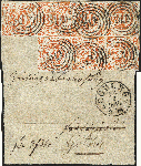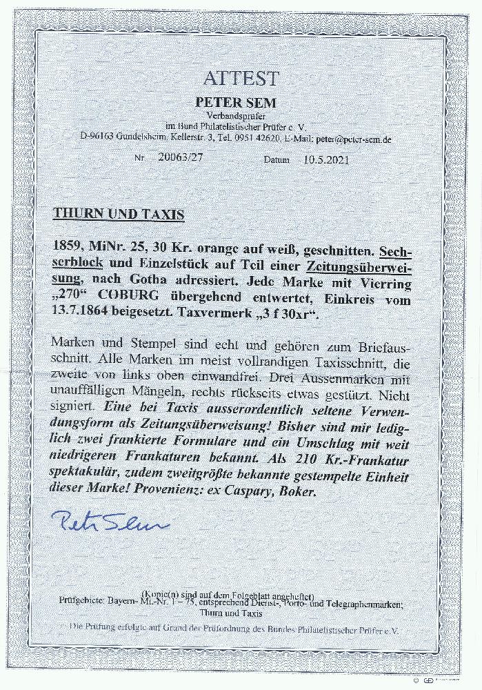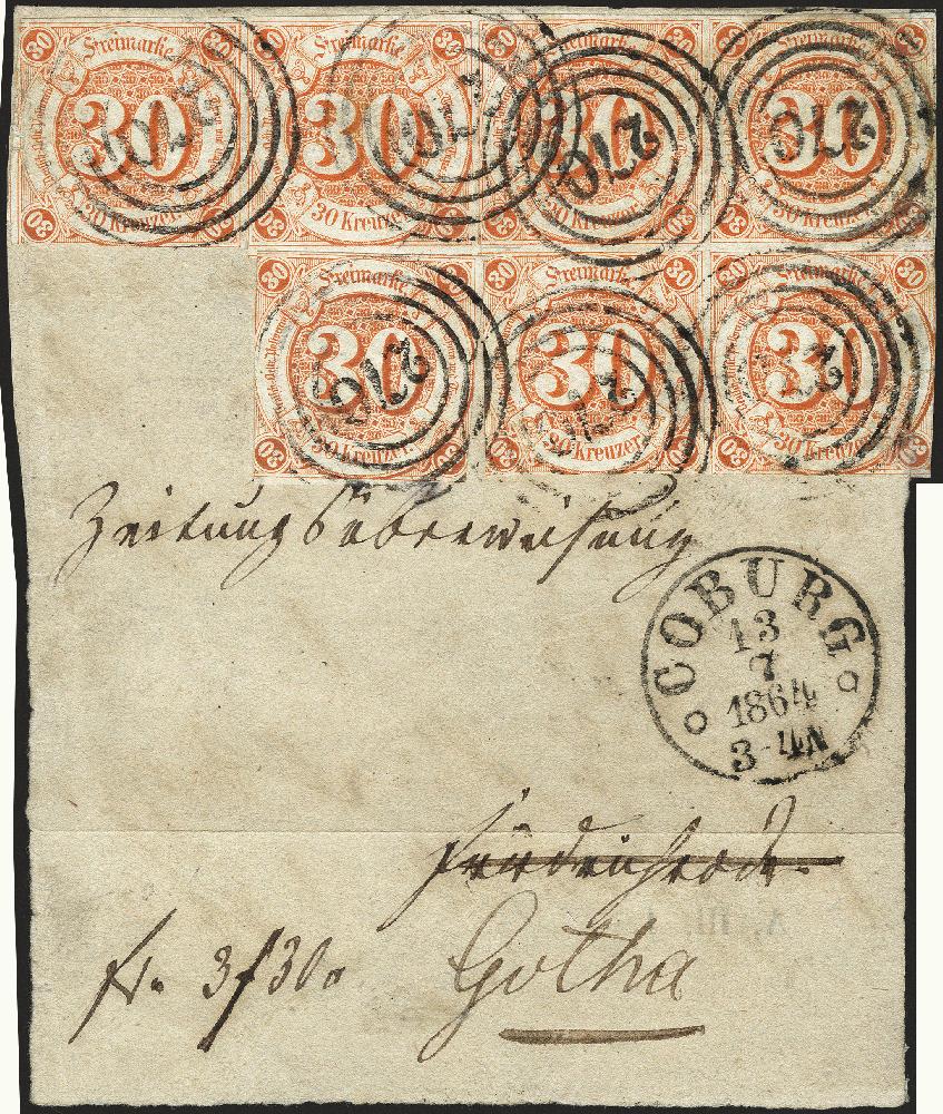| Zusatzinformationen und Suchstichworte: | 377. Auktion Heinrich Köhler 20. - 25. September 2021 Los 262 1859/61, 30 Kreuzer orange im unregelmäßigen 6er-Block zusammen mit Einzelmarke, alle farbfrisch und im meist vollrandigen Taxisschnitt, mit Nummer "270" und sauber nebengesetztem Einkreisstempel "COBURG 13 7 1864" auf Teil einer Zeitungsüberweisung nach Friedrichroda, nachgesandt nach Gotha. Der nebengesetzte Taxvermerk "3f 30x" zeigt die Vollständigkeit der Frankatur. Rückseitig Teil der Auflistung. 3 Außenmarken mit unauffälligen Mängeln, rechts rückseitig etwas gestützt. Eine spektakuläre 210 Kreuzer-Frankatur mit der zweitgrößten bekannten gebrauchten Einheit dieser Marke. Bisher sind lediglich 3 weitere frankiert Zeitungsüberweisungen von Thurn und Taxis bekannt. Jedoch mit weit niedrigeren Frankaturen. Ein einmaliges Stück. Fotoattest Sem BPP (2021) Ausruf 5.000,00 EUR Zuschlag 9.000,00 EUR (aus der Sammlung Erivan Haub) |