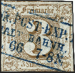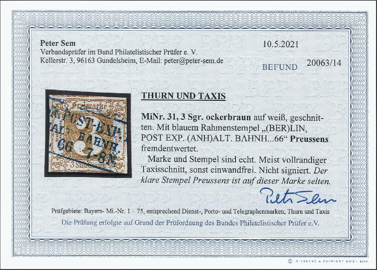 | Zusatzinformationen und Suchstichworte: | 377. Auktion Heinrich Köhler 20. - 25. September 2021 Los 263 1862/64, Farbänderung 3 Silbergroschen ockerbraun im meist vollrandigen Taxisschnitt mit sauber aufgesetztem blauen preußischen Rahmenstempel "(BER)LIN POST EXP.(ANH)ALT BAHNH. .. 66". Fotobefund Sem BPP Ausruf 100,00 EUR Zuschlag 400,00 EUR (aus der Sammlung Erivan Haub) |