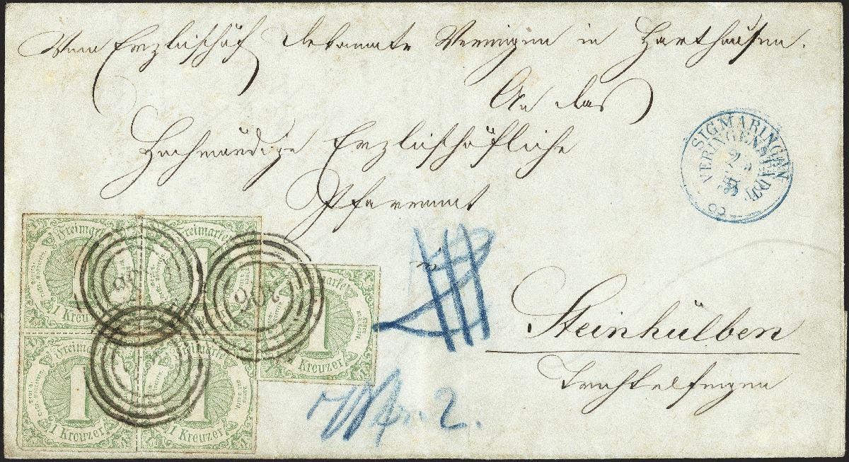 | Zusatzinformationen und Suchstichworte: | 377. Auktion Heinrich Köhler 20. - 25. September 2021 Los 267 1 Kreuzer gelbgrün, 4er-Block und Einzelstück, alle farbfrisch, die linke untere Marke des 4er-Blocks gering eckrund, sonst allseits guter Durchstich, mit sauber aufgesetzter Nummer "306" auf komplettem Faltbrief mit sauber nebengesetztem Einkreisstempel "SIGMARINGEN VERINGENSTADT 25 5" (1867) nach Steinhöben, portogerecht frankiert mit 3 Kreuzern Porto und 2 Kreuzern Land-Bestellgeld, letzteres vorderseitig als Weiterfranko vermerkt. Eine attraktive und in dieser Form sehr seltene Block-Frankatur. Fotoattest Sem BPP (2021) Ausruf 800,00 EUR Zuschlag 2.000,00EUR (aus der Sammlung Erivan Haub) |