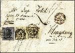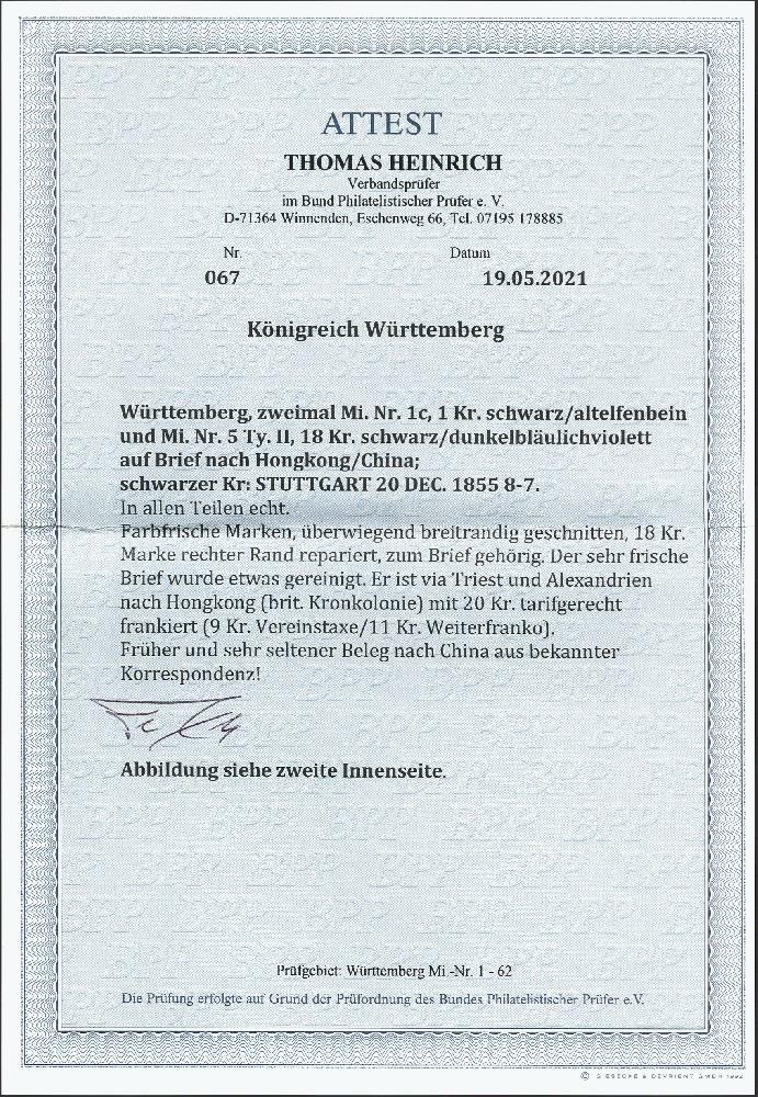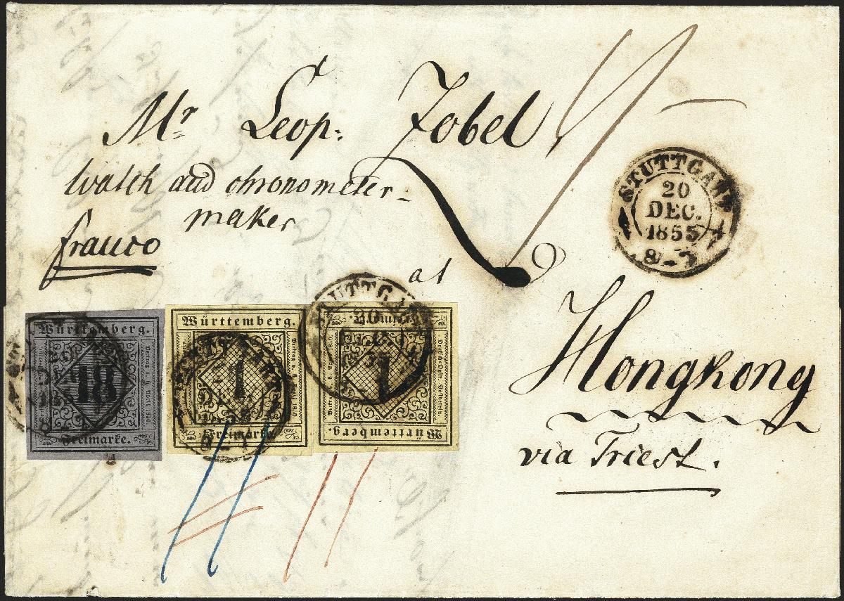 | Zusatzinformationen und Suchstichworte: | 377. Auktion Heinrich Köhler 20. - 25. September 2021 Los 273 1851, 1 Kreuzer schwarz auf altelfenbein, 2 Einzelwerte zusammen mit 18 Kreuzer schwarz auf dunkelbläulichviolett, letztere rechts unten kleine Ergänzung der Randlinie, sonst alle voll- bis meist breitrandig und farbfrisch, mit sauber auf- und nebengesetztem Doppelkreisstempel "STUTTGART 20 DEC. 1855" auf Faltbrief mit Teil des Inhaltes via Triest, Alexandria und der 'Overland Mail' nach Hongkong, China mit interessanter Adresse "Mr. Leop. Zobel, Watch and Chronometer Maker". Eine 1 Kreuzer unten unbedeutender kleiner Einschnitt und die Briefhülle leicht gereinigt, sonst einwandfreie und sehr attraktive Erhaltung. Ein seltener früher Brief nach Ostasien. Fotoattest Heinrich BPP (2021) Ausruf 5.000,00 EUR Zuschlag 23.000,00 EUR (aus der Sammlung Erivan Haub) |