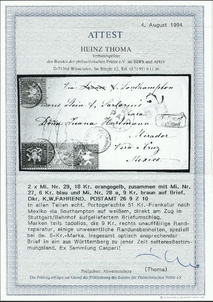 | Zusatzinformationen und Suchstichworte: | 377. Auktion Heinrich Köhler 20. - 25. September 2021 Los 278 1863, 6 Kreuzer blau, 9 Kreuzer dunkelbraun und 2 Einzelwerte 18 Kreuzer orangegelb, alle farbfrisch mit Kreisstempel "WÜRTT. FAHREND. POSTAMT Z10 26/9" (1865) auf Briefkuvert der 2. Gewichtsstufe mit nebengesetztem Rahmenstempel "Stuttgart Bahnhof" über England mit vorderseitigem "LONDON PAID 28 SP 65" nach Vera Cruz in Mexiko. Das Porto setzt sich zusammen aus 6 Kreuzern Vereinstaxe und 45 Kreuzern Weiterfranko; das mexikanische Inlandsporto in Höhe von "2" Reales wurde vom Empfänger eingezogen. Die Frankatur teils kleinere Randmängel, die bei den beiden links klebenden Marken behoben wurden, sonst sehr schöne Erhaltung. Ein attraktiver und seltener Brief in frischer Erhaltung. Signiert Decker und Schlesinger, Fotoatteste Thoma BPP (1994) und Heinrich BPP (2021) Ausruf 3.000,00 EUR Zuschlag 29.000,00 EUR (aus der Sammlung Erivan Haub) |