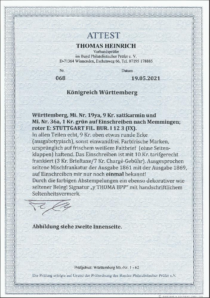 | Zusatzinformationen und Suchstichworte: | 377. Auktion Heinrich Köhler 20. - 25. September 2021 Los 279 1869, Ovalausgabe 1 Kreuzer grün in Mischfrankatur mit 1861/62, 9 Kreuzer sattkarmin, beide sehr schön farbfrisch und ausgabetypisch gezähnt bzw. einwandfrei durchstochen, mit sauber auf- und nebengsetztem roten Einkreisstempel "STUTTGART FIL.BUR.I 12 3 (IX)" auf eingeschriebener Briefhülle (2 Seitenklappen fehlend) mit sauber nebengesetztem blauen "CHARGÉ" nach Memmingen. Eine außerordentlich seltene, drei Ausgaben überspringende Mischfrankatur, die nur ein weiteres Mal belegt ist; durch die farbigen Stempel ein wohl einmaliges Stück. Signiert Thoma BPP mit Fotoattest (1980), Fotoattest Heinrich BPP (2021) Ausruf 3.000,00 EUR Zuschlag 5.800,00 EUR (aus der Sammlung Erivan Haub) |