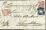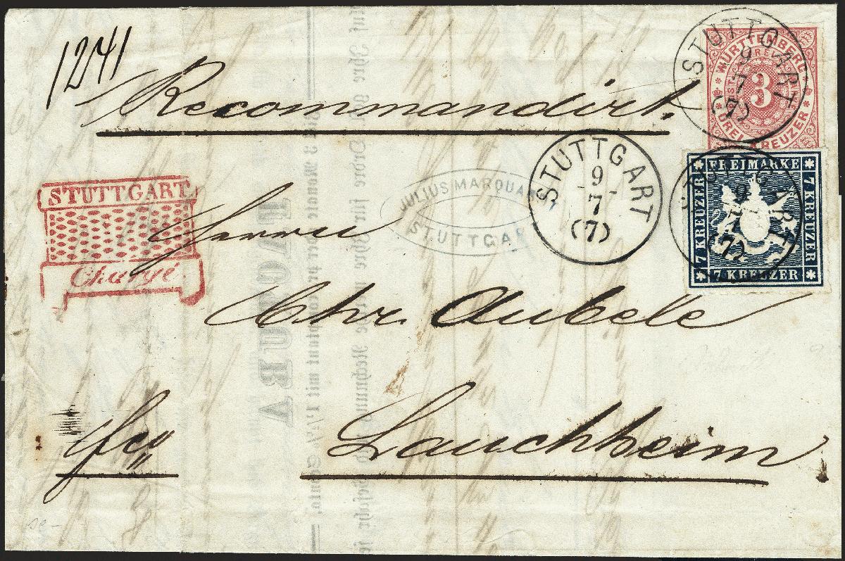 | Zusatzinformationen und Suchstichworte: | 377. Auktion Heinrich Köhler 20. - 25. September 2021 Los 280 1869, Ovalausgabe 3 Kreuzer hellrosa in Mischfrankatur mit 1868, 7 Kreuzer schieferblau, beide farbfrisch und gut durchstochen, mit glasklar auf- und nebengesetztem Einkreisstempel "STUTTGART 9/7" (1869) auf komplettem Chargé-Brief mit nebengesetztem roten Zierstempel "STUTTGART / Chargé" nach Lauchheim mit Bahnpost und Ankunftsstempeln. Die 3 Kreuzer geringe Wellung, sonst tadellose und sehr frische Erhaltung. Ein besonders attraktiver Chargé-Brief Ausruf 500,00 EUR Zuschlag 1.350,00 EUR (aus der Sammlung Erivan Haub) |