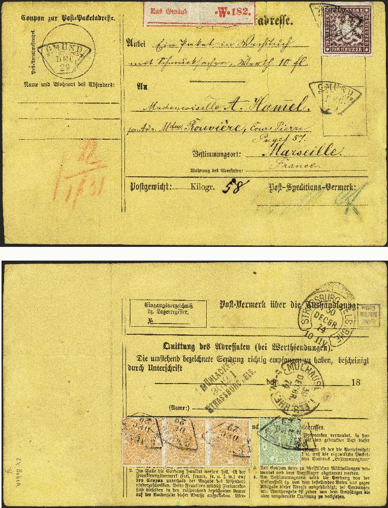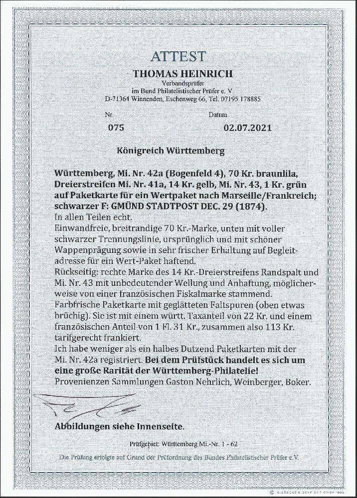 | Zusatzinformationen und Suchstichworte: | 377. Auktion Heinrich Köhler 20. - 25. September 2021 Los 281 70 Kreuzer braunlila, farbfrisch und gleichmäßig breitrandig mit schwarzem Fächerstempel "GMÜND STADTPOST DEC. 29" (1874) vorderseitig auf kompletter Wert-Paketkarte nach Marseille mit rückseitiger Zufrankatur 1869, Ovalausgabe 14 Kreuzer gelb im waagerechten 3er-Streifen und 1874, 1 Kreuzer grün, gezähnt (2 Werte kleine Beanstandungen). Die Paketkarte ist mit einem württembergischen Taxanteil von 22 Kreuzern und einem französischen Anteil von 1 Gulden 31 Kreuzern tarifgerecht frankiert. Faltspuren außerhalb der Frankatur, sonst sehr schöne und einwandfreie Erhaltung. Vollständige Paketkarten mit dem 70 Kreuzer-Wert gehören zu den großen Seltenheiten der Württemberg-Philatelie. Fotoattest Heinrich BPP (2021) Ausruf 25.000,00 EUR Zuschlag 65.000,00 EUR (aus der Sammlung Erivan Haub) |