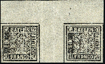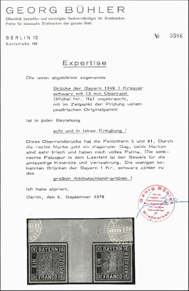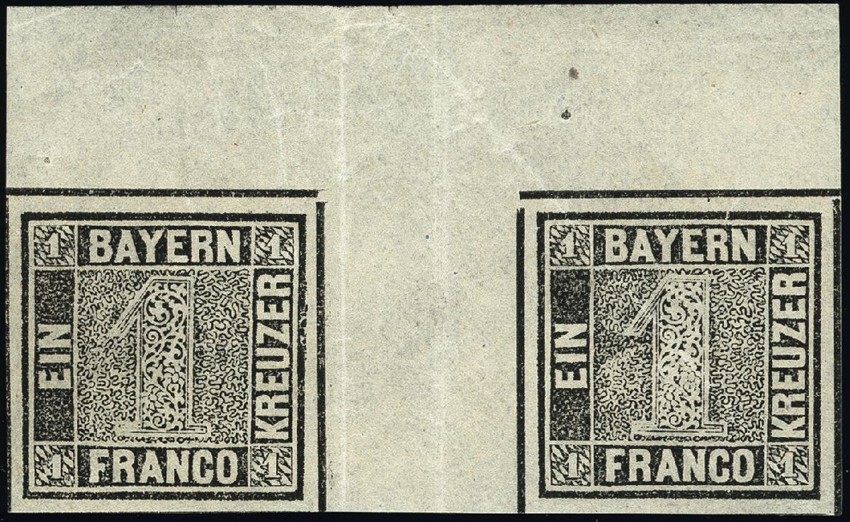 | Zusatzinformationen und Suchstichworte: | 377. Auktion Heinrich Köhler 20. - 25. September 2021 Los 9007 1849, 1 Kreuzer grauschwarz im waagerechten Oberrandpaar mit 13,5 mm breiten Zwischensteg, farbfrisch und allseits breitrandig mit zumindest Teilen aller Zwischenlinien, oben mit ca. 13 mm Bogenrand, ungebraucht mit frischem Originalgummi, die linke Marke postfrisch. Im Zwischensteg 2 übliche Faltspuren, in der rechten Marke unauffällige diagonale Bugspur. Insgesamt sehr schöne und frische Erhaltung. Abgesehen von den 2 noch existierenden Doppelbogen sind nur ganz wenige Brückenpaare der Nr. 1 bekannt geworden; als Oberrandpaar Unikat. Signiert Georg Bühler mit Fotoattest (1976), Fotoattest Stegmüller BPP (2003) Zuschlag 17.000,00 EUR |