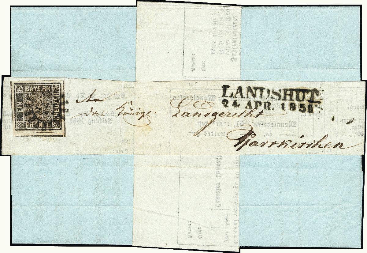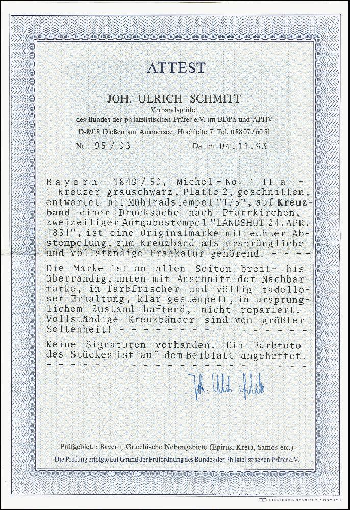 | Zusatzinformationen und Suchstichworte: | 377. Auktion Heinrich Köhler 20. - 25. September 2021 Los 9014 1849, 1 Kreuzer schwarz, Platte 2, farbfrisch und an allen Seiten breit- bis überrandig, dreiseitig mit Schnittlinien, dabei unten mit praktisch kompletter Randlinie der Nachbarmarke, mit übergehend und sauber aufgesetztem gMR "175" und nebengesetztem Langstempel "LANDSHUT 24 APR. 1851" auf komplettem Kreuzband einer Drucksache an das Landgericht Pfarrkirchen. Sehr schöne ursprüngliche Erhaltung, die Frankatur tadellos. Kreuzbandsendungen der altdeutschen Staaten sind kaum erhalten geblieben, mit dem 'Schwarzen Einser' hat die Heinrich Köhler Kartei keine weitere registriert. Ein bemerkenswertes Stück. Fotoattest Schmitt BPP (1993) (Inhalt aus optischen Gründen ergänzt) Zuschlag 8.000,00 EUR |