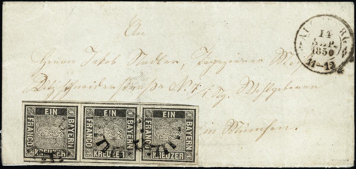 | Zusatzinformationen und Suchstichworte: | 377. Auktion Heinrich Köhler 20. - 25. September 2021 Los 9015 1849/50, 1 Kreuzer schwarz, Platte 2, senkrechter 3er-Streifen, dreiseitig breitrandig mit zumindest Teilen aller Zwischenlinien, unten rechts in der Randlinie leicht berührt (hier aus optischen Gründen etwas dünn geschabt), sonst auch hier voll- bis breitrandig, mit leicht aufgesetztem gMR "18" und nebengesetztem DKr. "AUGSBURG 14 SEP. 1850" auf kleiner Briefhülle nach München mit Ankunftsstempel vom selben Tag. Eine seltene und sonst einwandfreie Streifenfrankatur. Signiert Pfenninger und Fotoattest Brettl BPP (1982) Zuschlag 7.200,00 EUR |
