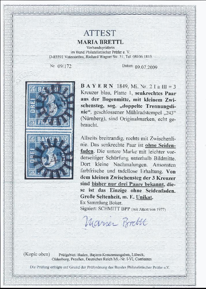 | Zusatzinformationen und Suchstichworte: | 377. Auktion Heinrich Köhler 20. - 25. September 2021 Los 9016 1849, 3 Kreuzer blau, Platte 1, senkrechtes Zwischenstegpaar aus der Bogenmitte mit doppelten Trennungslinien, sogenannte 'Kleine Brücke', sehr schön farbfrisch und allseits breitrandig, rechts mit voller Zwischenlinie. Das seltene Paar weist zusätzlich die Abart "fehlender Seidenfaden" auf. Die untere Marke kleine vorderseitige Schürfung unterhalb der Bildmitte (hier kleine Nachmalungen), ansonsten tadellose Erhaltung. Gebrauchte Zwischenstegpaare von Bayern gehören zu den großen Seltenheiten des Sammelgebietes; von den sogenannten 'Kleinen Brücken' hat die Heinrich Köhler Kartei 5 Stück der Mi.-Nr. 1 und nur 2 weitere der Mi.-Nr. 2 registriert, von denen die hier angebotene die weitaus attraktivste ist. Ein in dieser Form einmaliges Stück der Bayern-Philatelie. Signiert Schmitt BPP mit Fotoattest (1977), Fotoattest Brettl BPP (2009) Ausruf 15.000,00 EUR |