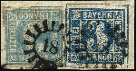 | Zusatzinformationen und Suchstichworte: | 377. Auktion Heinrich Köhler 20. - 25. September 2021 Los 9020 1849, 3 Kreuzer dunkelblau, Platte 1 in wertstufengleicher Mischfrankatur mit 1850, 3 Kreuzer hellblau, Platte 2, beide farbfrisch und voll- bis breitrandig, die Platte 1 links mit Scherenschnitt bis an die Einfassungslinie reichend, sauber entwertet mit gMR "18" auf kleinem Briefstück. Schöne ursprüngliche und sonst einwandfreie Erhaltung; eine sehr seltene Mischfrankatur, signiert Schmitt BPP und Fotoattest Brettl BPP (2000) Zuschlag 800,00 EUR |