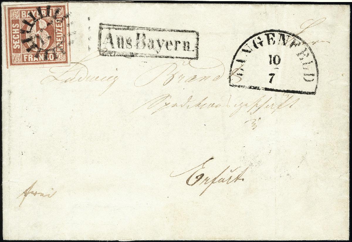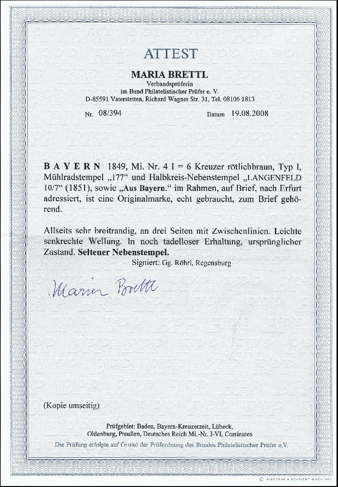 | Zusatzinformationen und Suchstichworte: | 377. Auktion Heinrich Köhler 20. - 25. September 2021 Los 9024 1849, 6 Kreuzer braunorange, Type I, farbfrisch und allseits breitrandig mit Zwischenlinien an 3 Seiten, mit leicht aufgesetztem gMR "177" und nebengesetztem Halbkreis "LANGENFELD 10/7" (1851) auf Briefhülle (?) nach Erfurt mit vorderseitigem Rahmenstempel "Aus Bayern". Die Marke mit leichter senkrechter Wellung, aber noch tadellos. Ein in dieser Form seltener Brief in ursprünglicher Erhaltung. Fotoattest Brettl BPP (2008) Provenienz: Georg Röhrl (Eigentümerzeichen) Zuschlag 540,00 EUR |