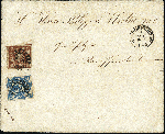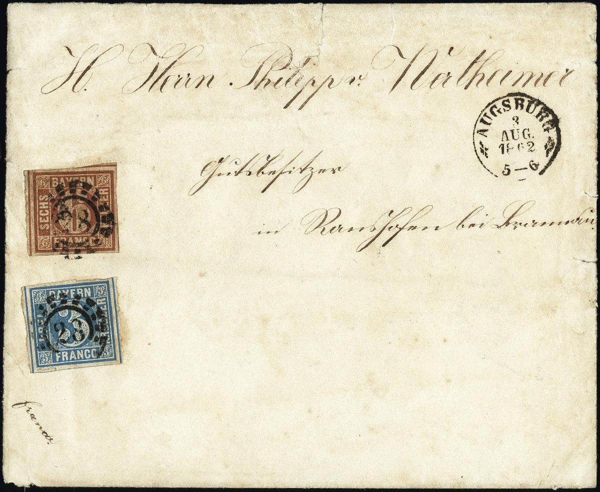 | Zusatzinformationen und Suchstichworte: | 377. Auktion Heinrich Köhler 20. - 25. September 2021 Los 9025 1849, 6 Kreuzer braunorange, Typ I, in Mischfrankatur mit 1850/58, 3 Kreuzer blau, Platte 5, beide voll- bis meist breitrandig mit jeweils sauber aufgesetztem oMR "28" auf Briefkuvert mit nebengesetztem DKr. "AUGSBURG 3 AUG. 1862" nach Ranshofen bei Braunau in Oberösterreich mit Durchgangsstempel von Salzburg und Ankunftsstempel. Die 6 Kreuzer mit kleinen und in diesem Fall völlig bedeutungslosen Knittern und gering unfrisch, die 3 Kreuzer tadellos; das Kuvert mit leichten Randfehlern, oben gestützt und etwas gesäubert. Schon eine lose Mi.-Nr. 4I mit offenem Mühlradstempel entwertet ist eine große Seltenheit; die hier vorliegende Mischfrankatur ist die späteste registrierte der ersten Ausgabe und ein bedeutendes Unikat der Bayern-Philatelie. Fotoattest Brettl BPP (2002) Ausruf 10.000,00 EUR |