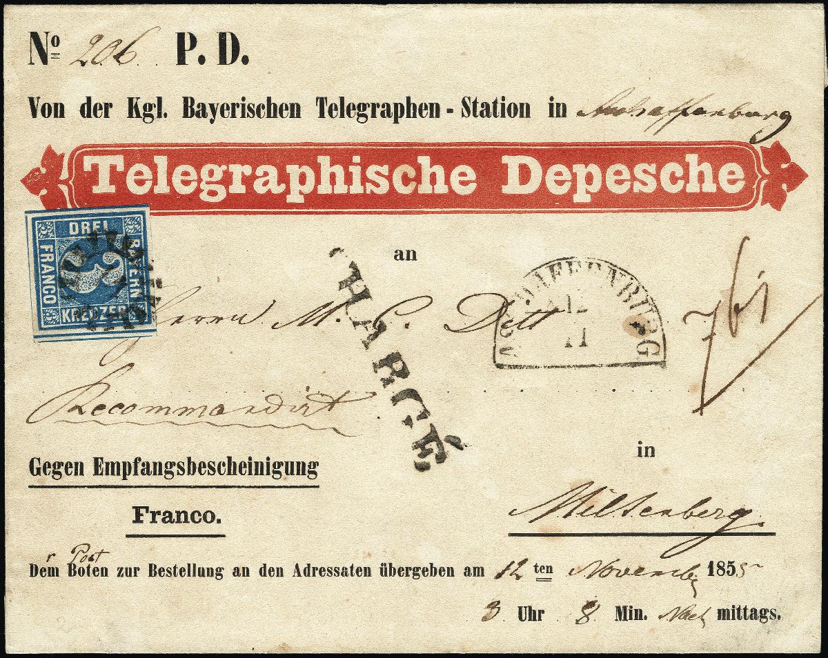 | Zusatzinformationen und Suchstichworte: | 377. Auktion Heinrich Köhler 20. - 25. September 2021 Los 9030 3 Kreuzer blau, Platte 3, farbfrisch und allseits breitrandig geschnitten, dreiseitig mit Zwischenlinien, mit sauber aufgesetztem gMR "14" und nebengesetztem Halbkreis "ASCHAFFENBURG 12/11" (1855) auf "Telegrafischer Depesche" als Chargé-Brief nach Miltenberg mit rückseitigem Lacksiegel der Telegrafen-Station. Der gedruckte Text "Dem Boten..." in "Der Post..." abgeändert. Ein sehr attraktives Stück in einwandfreier Erhaltung. Fotoattest Brettl BPP (1999) Zuschlag 4.600,00 EUR |