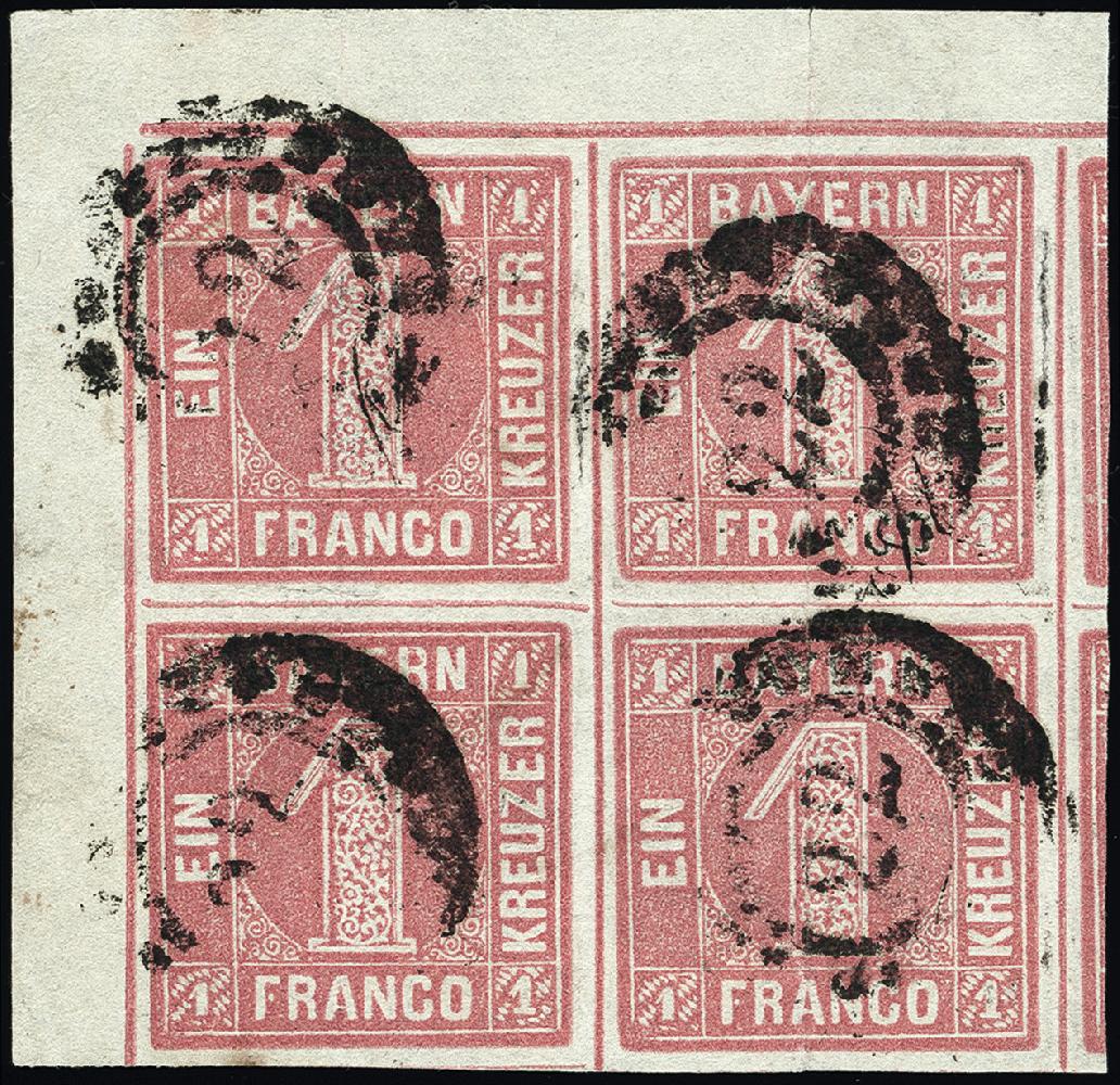 | Zusatzinformationen und Suchstichworte: | 377. Auktion Heinrich Köhler 20. - 25. September 2021 Los 9034 1 Kreuzer rosa, Type 1, 4er-Block aus der linken oberen Bogenecke, farbfrisch und allseits breit- bis überrandig, rechts mit Teilen beider Nachbarmarken, oben und links mit ca. 5 mm Bogenrand, entwertet durch oMR "22" ASCHAFFENBURG. Das rechte Paar unbedeutende leichte Knitterung, sonst tadellos. Eine sehr seltene und außerordentlich attraktive Einheit. Fotoattest Brettl BPP (1988) Ausruf 1.000,00 EUR |