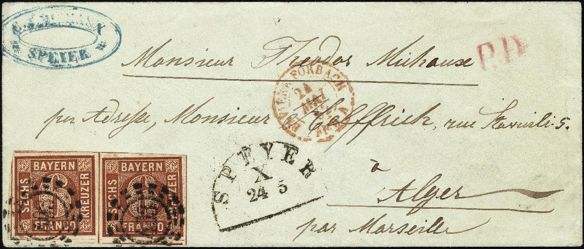 | Zusatzinformationen und Suchstichworte: | 377. Auktion Heinrich Köhler 20. - 25. September 2021 Los 9040 6 Kreuzer braun, Platte 3, waagerechtes Paar, sehr schön farbfrisch und allseits breit- bis überrandig mit sauberem oMR "493" und nebengesetztem Halbkreisstempel "SPEYER 24/5" (1862) auf kleinem Briefkuvert über Frankreich nach Algier, Algerien. Der Brief ist portogerecht frankiert; es galt derselbe Tarif wie nach Frankreich. Tadellose und für diese Destination sehr frische Erhaltung. Ein attraktiver und seltener Brief nach Nordafrika; es sind nur ganz wenige Briefe mit dieser Destination registriert. Signiert Kruschel und Fotoattest Schmitt BPP (1990) Zuschlag 4.600,00 EUR |