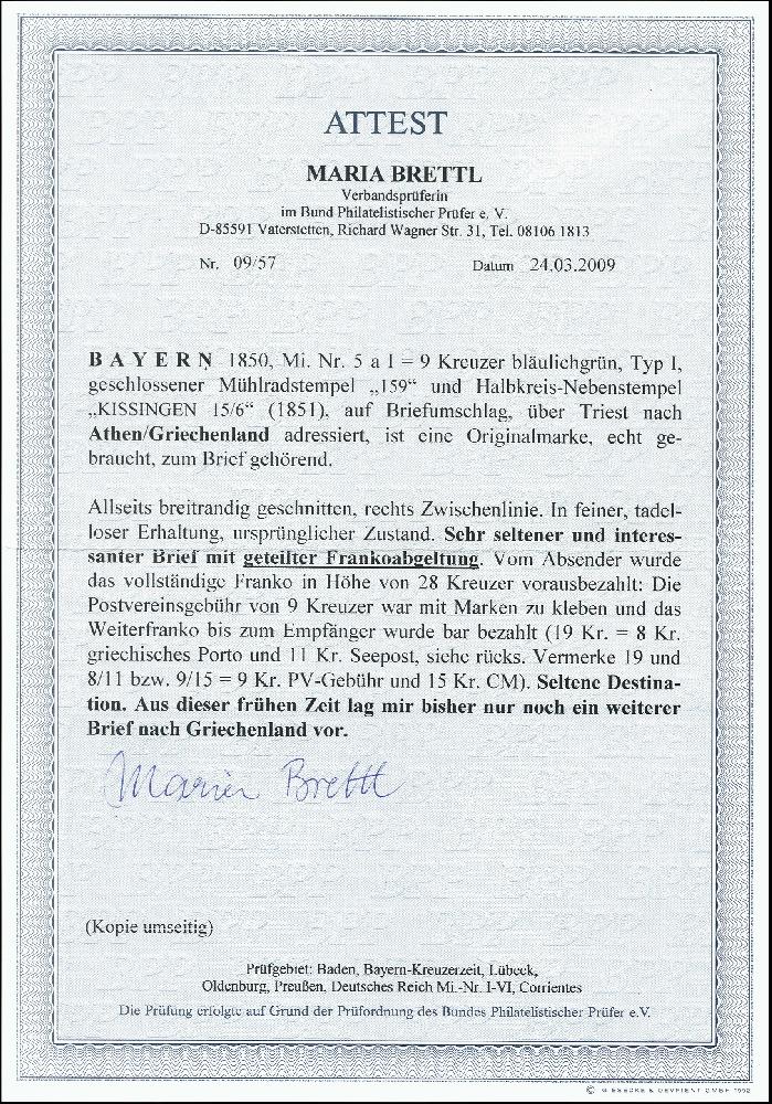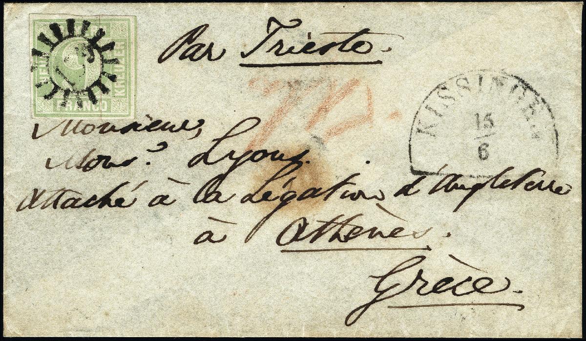 | Zusatzinformationen und Suchstichworte: | 377. Auktion Heinrich Köhler 20. - 25. September 2021 Los 9041 1850, 9 Kreuzer bläulichgrün, Type I, sehr schön farbfrisch und allseits breitrandig geschnitten, rechts mit voller Zwischenlinie, entwertet durch gMR "159" auf Briefhülle mit nebengesetztem Halbkreis "KISSINGEN 15/6" (1851) über Triest an einen Angehörigen der britischen Botschaft in Athen. Der Brief war bis zum Empfangsort voll bezahlt mit insgesamt 28 Kreuzern, jedoch vertragsgemäß nur das Postvereinsporto verklebt; das Weiterfranko, bestehend aus 11 Kreuzern Seepostporto sowie 8 Kreuzern griechischem Porto ist rückseitig vermerkt. Ein attraktiver und außerordentlich seltener Brief. Briefe von Bayern nach Griechenland sind sehr selten, mit einem geteiltem Franko haben wir nur einen weiteren registriert. In Kombination mit der seltenen Marke ein sicherlich einmaliger Brief. Fotoattest Brettl BPP (2009) Zuschlag 8.500,00 EUR |